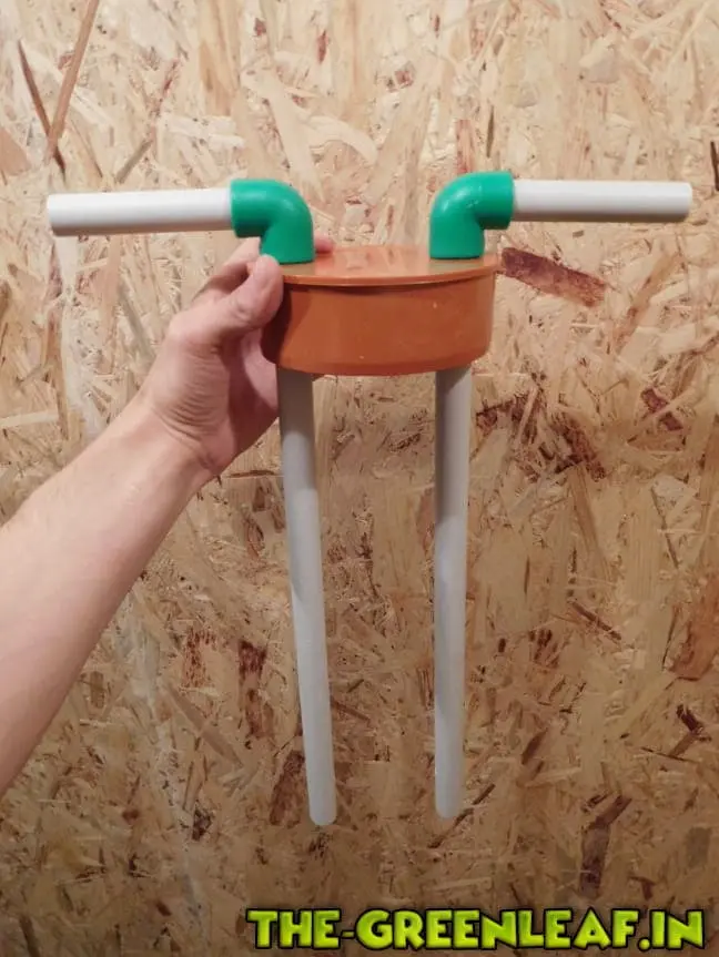 Was man braucht sind nur 2 PE Rohre mit 90grad Knick bei ca 2/3 Länge, eine HT Endkappe, Lochfräse und das wars.
