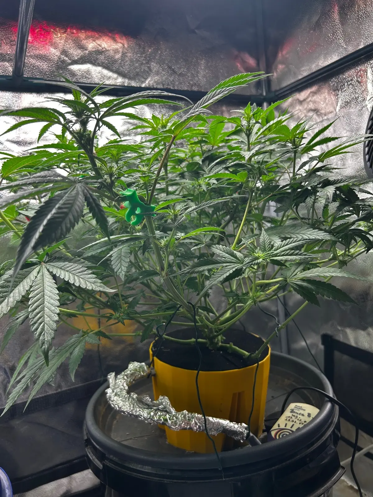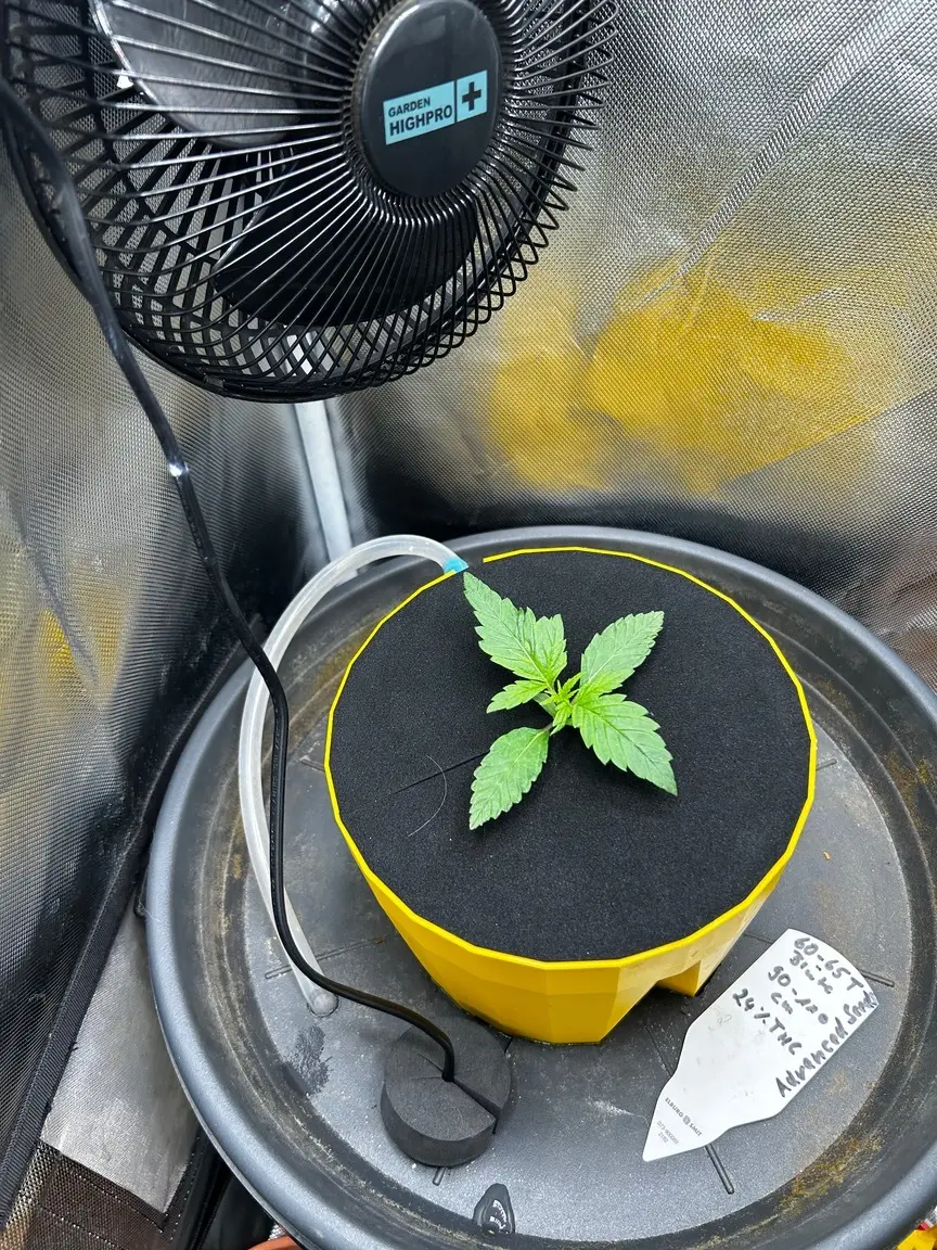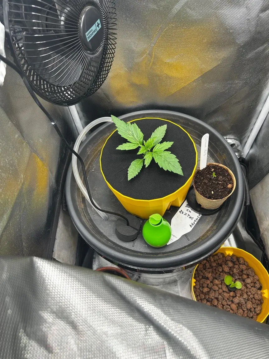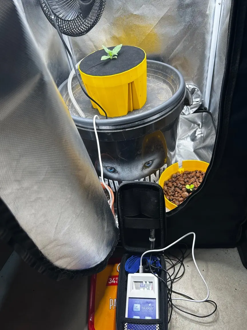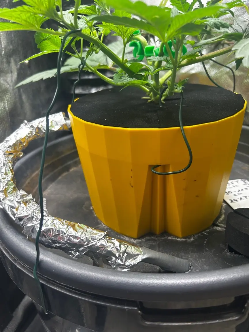 Es ist RDWC, der Pott oben hat ca 2L Blähton, einen Tropfring und darüber eine Neoprenscheibe. Soweit noch alles original Eco Farmer‘s HydroFarm. Den gelben Pott habe ich in einen großen Untersetzer eingepasst, der genau auf dem 35L-Eimer sitzt. Im Eimer eine billige Wasserpumpe und Nährlösung… bis dahin Wurzeln wachsen wird dauern.