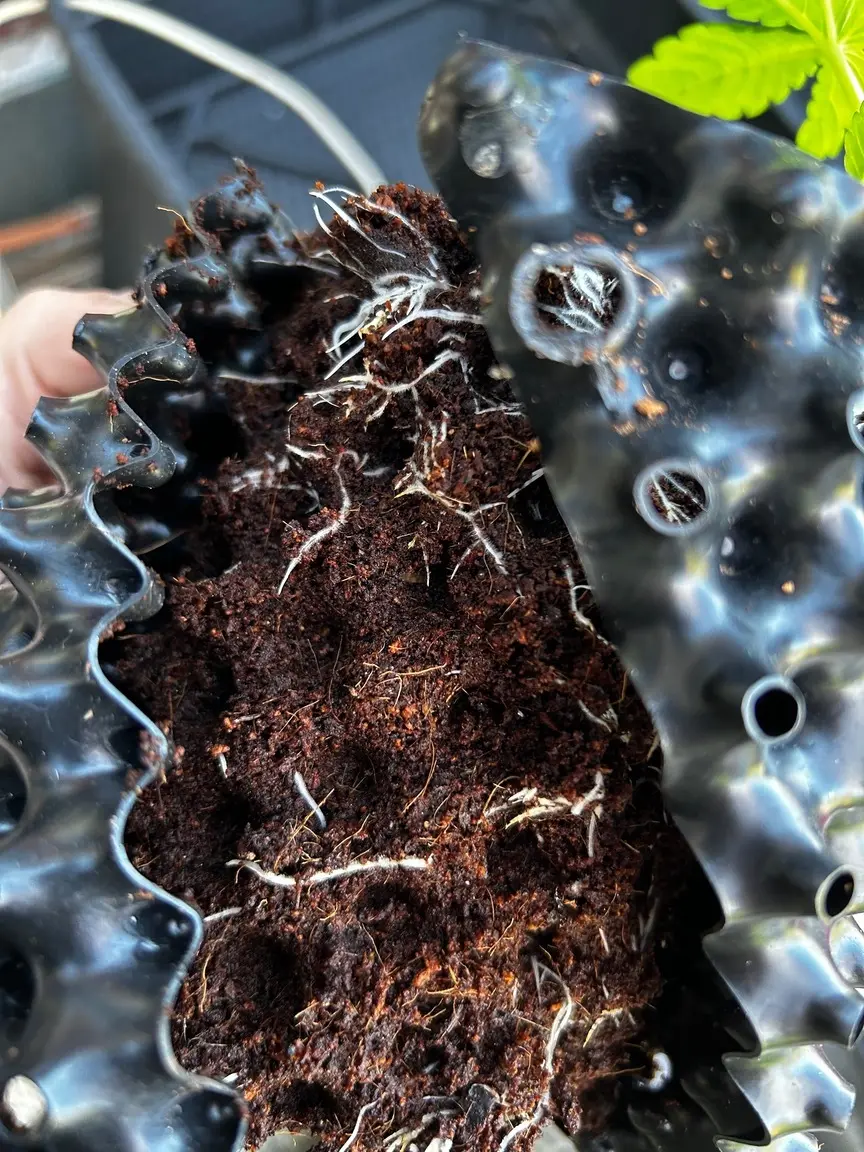 Als das Köpfchen zum zweiten Mal sichtbar war, kam der Eazyplug in einen 1L Airroottopf mit cocos. Da gieß ich 2-3x am Tag Wasser mit 4ml/L Formulex drüber.