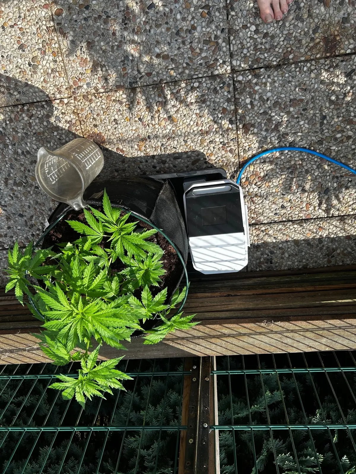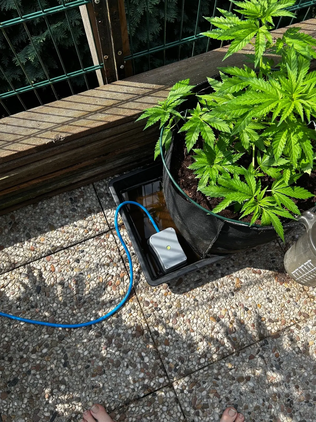 Es wurde mir mal wieder zu doof. 10L Schuhe auf dem Balkon ist Nix gutes, und warten bis der durchwurzelt ist, war mir auch zu doof. Also 40L Schuh her, passende Garlandschale drunter, Autopot easy2grow rein und an die outdoor blood diamonds geklemmt. BioBizz cocos und 10L Blähton kamen zum Einsatz. Den letzten Rest vom Terra Aquatica Test-organic-onepart ist jetzt auch an der Reihe. Dazu etwas „Great white“ mycorrhiza in den Tank und Hesi SuperVit auf die Blätter. Morgen steht da ein Baum! 😂
