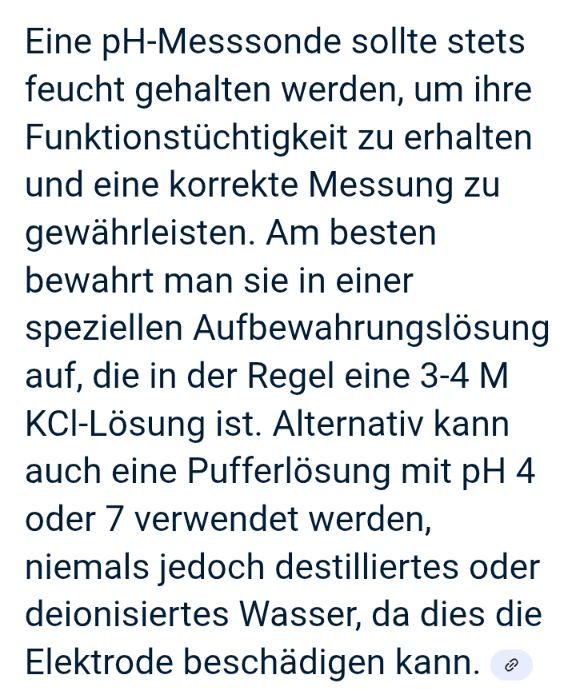 Dran denken, dass die Sonde nicht mit destilliertem Wasser zur Aufbewahrung gespült, oder gar darin aufbewahrt werden sollte, weil das die Ionen dort auswaschen würde, wo sie gebraucht werden.