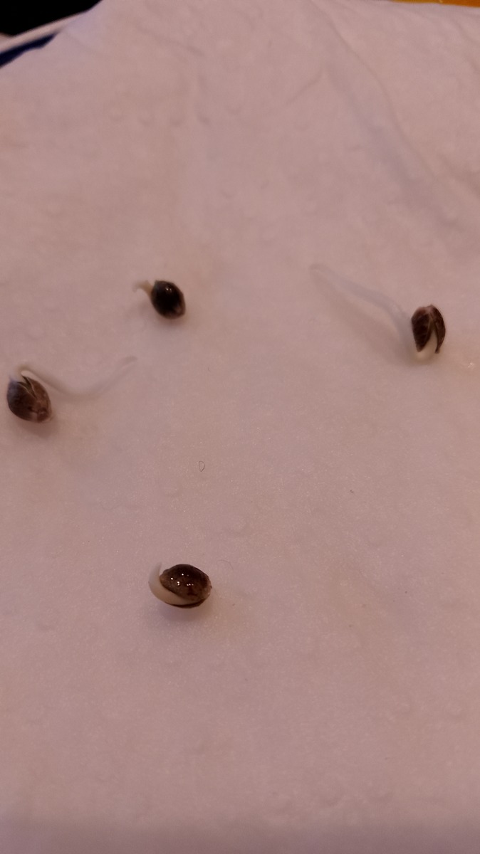 Gestern zum Keimen gelegt, schätze morgen kommen die in Erde. Dann erst ins Anzuchtzelt 40x40 x120 unter 40 Watt China LED . 🌴