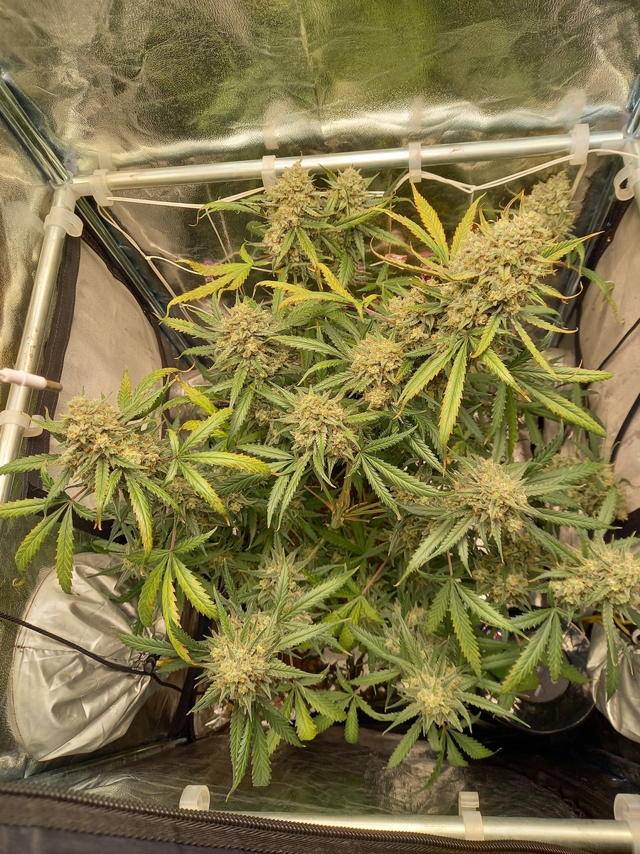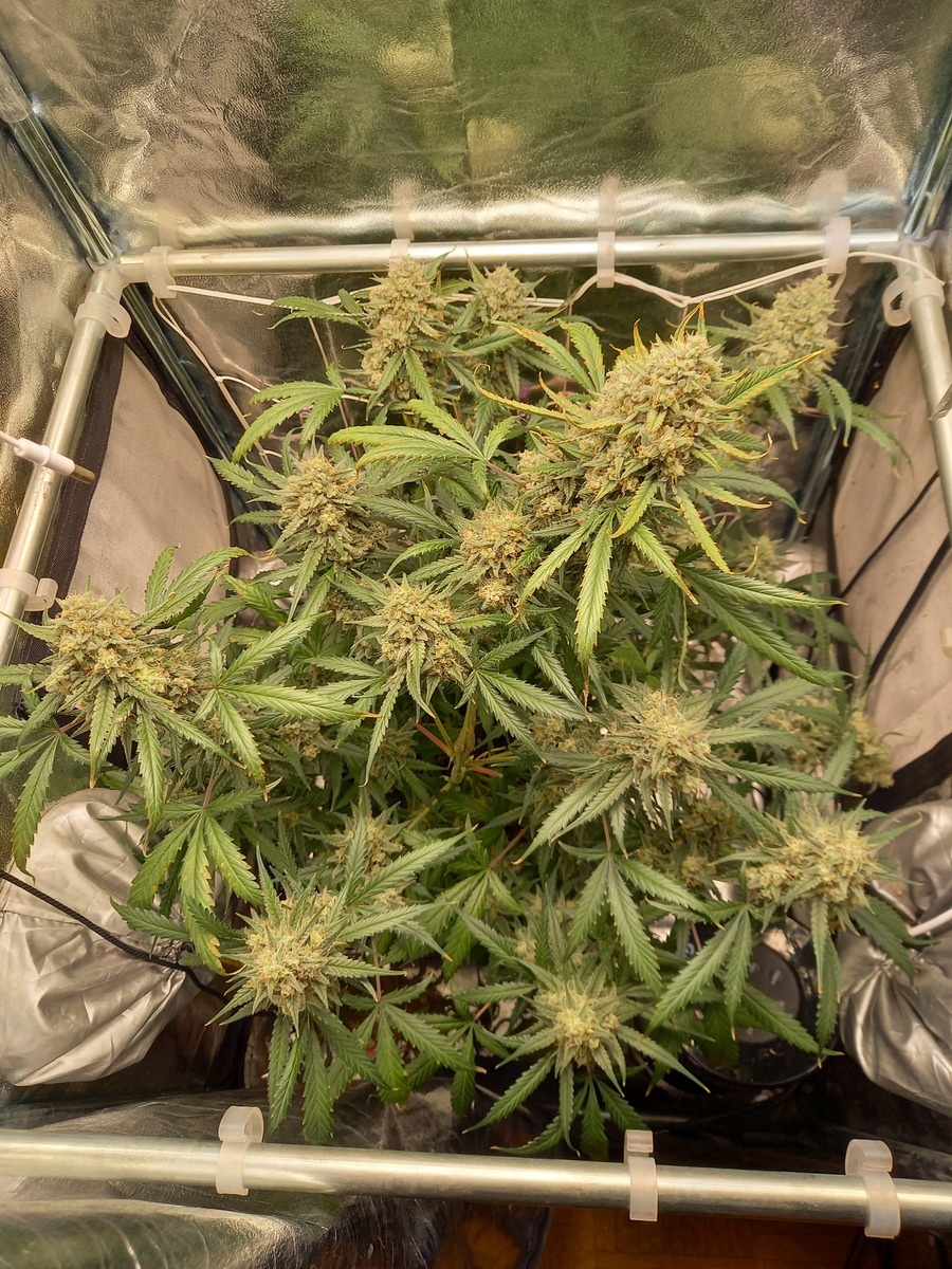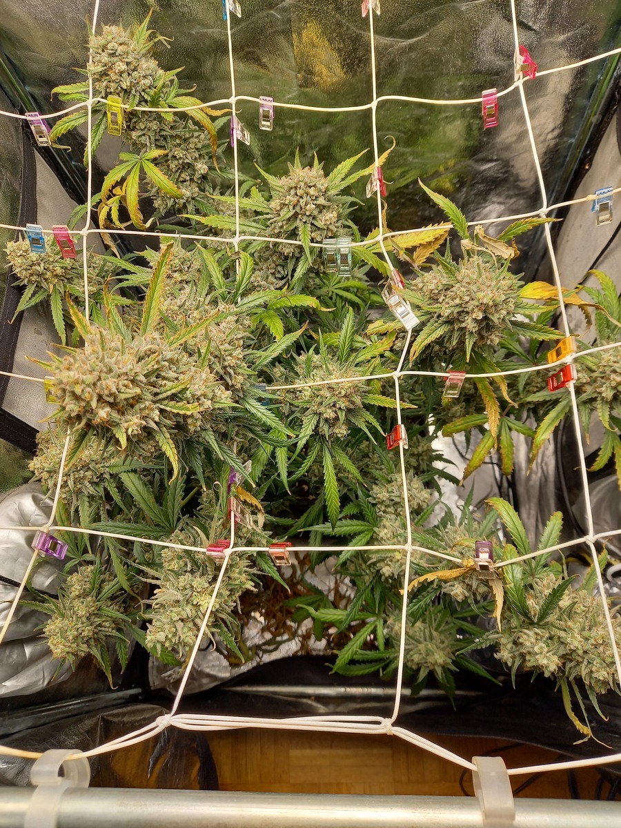 statt der angegebenen 9 wochen, hat es jetzt doch 11 gedauert - von keimen bis ernte - sie war eine kleine pflanze, wurde nix getrimmt, nur bissl gebogen, ernte jedoch scheint überraschend üppig auszufallen.