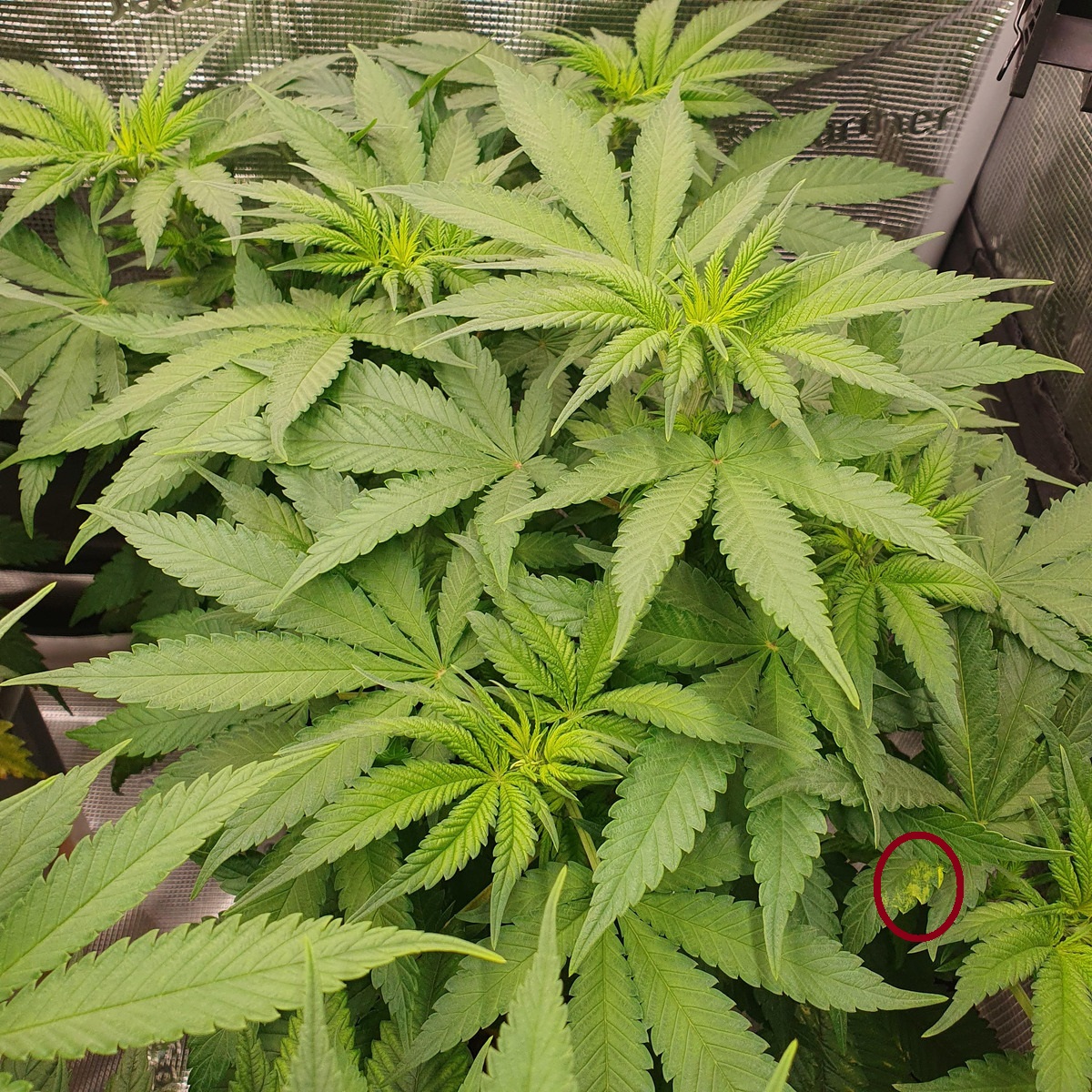 Ich hab da bei mir auch grad so ein Blatt entdeckt, erst dachte ich eventuell an TMV dann an einen Calmag Mangel.Letzteres kann aber eigentlich nicht sein,