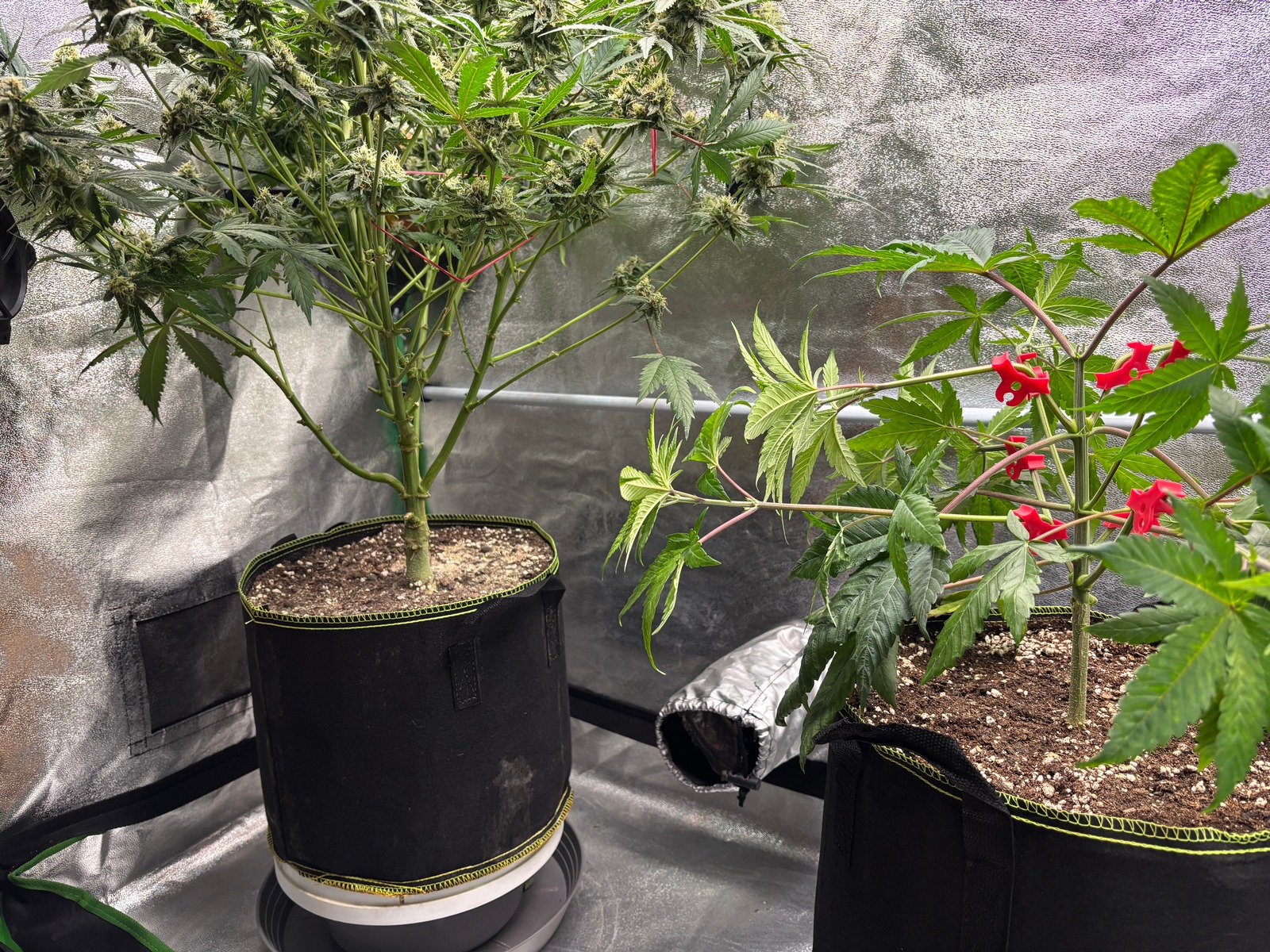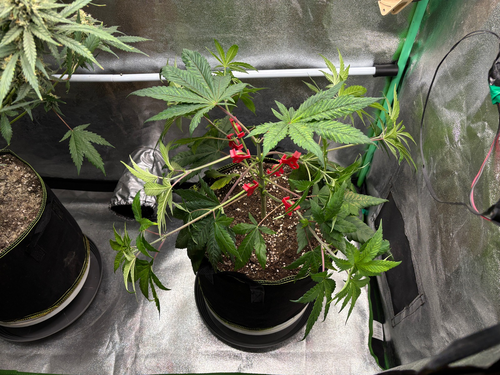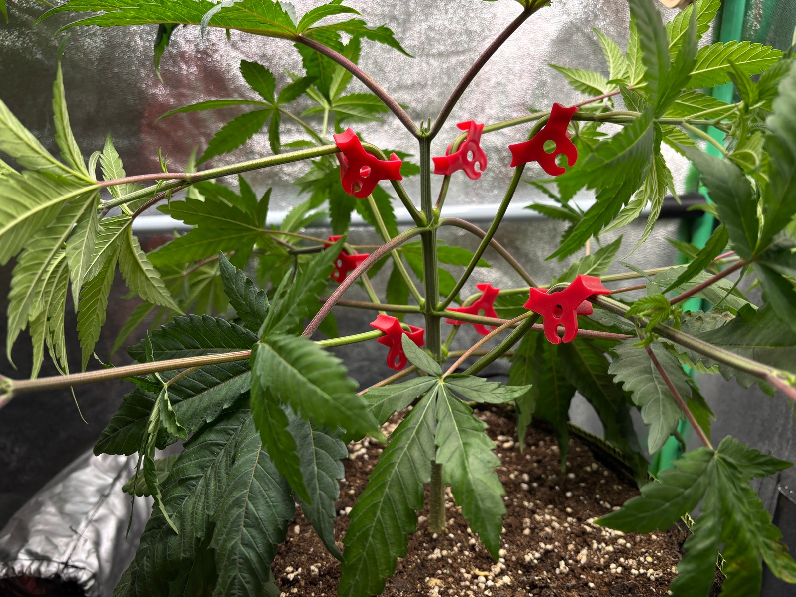 👨‍🌾🧑‍🔬So mag ich´s, schön ordentlich, clean und aufgeräumt. 😆 Wie man sieht habe ich ordentlich ✂️ LST/HST angewendet. Sie wurde an 🥬 4 Trieben ein 2. mal getoppt, die 2 unteren großen Triebe habe ich ebenfalls entfernt. Gegossen wurde mit moderaten 2 Liter🍋 ph-reguliertes 🫗Wasser.