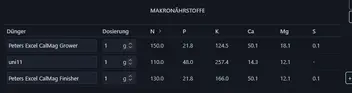 Das Substrat ist Pinienrinde fein. Es gibt mineralische Bewässerungsdüngung bei ca. EC 1,2-1,5, händisch, set.