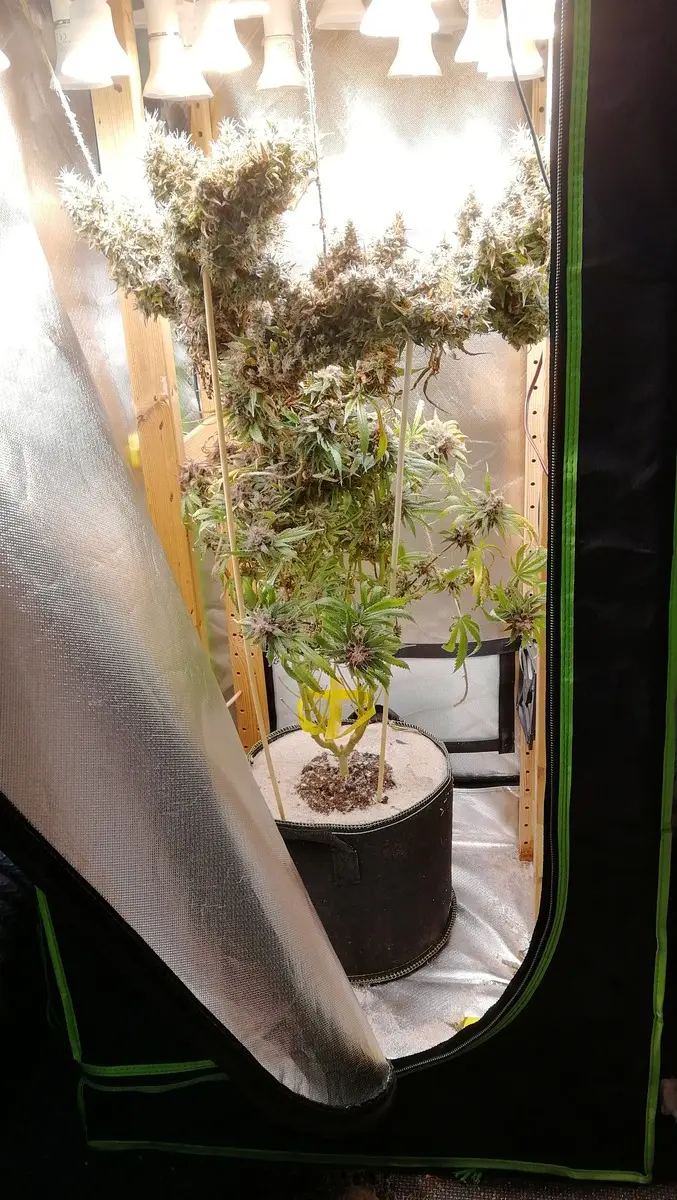 Die Dame stand alleine im Zelt, hatte gut 35l Substrat an den Füßen und stand dabei in einem luftigen Pflanzvliessack.