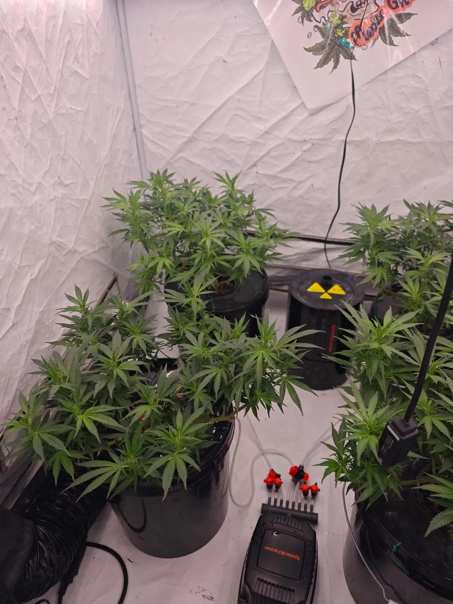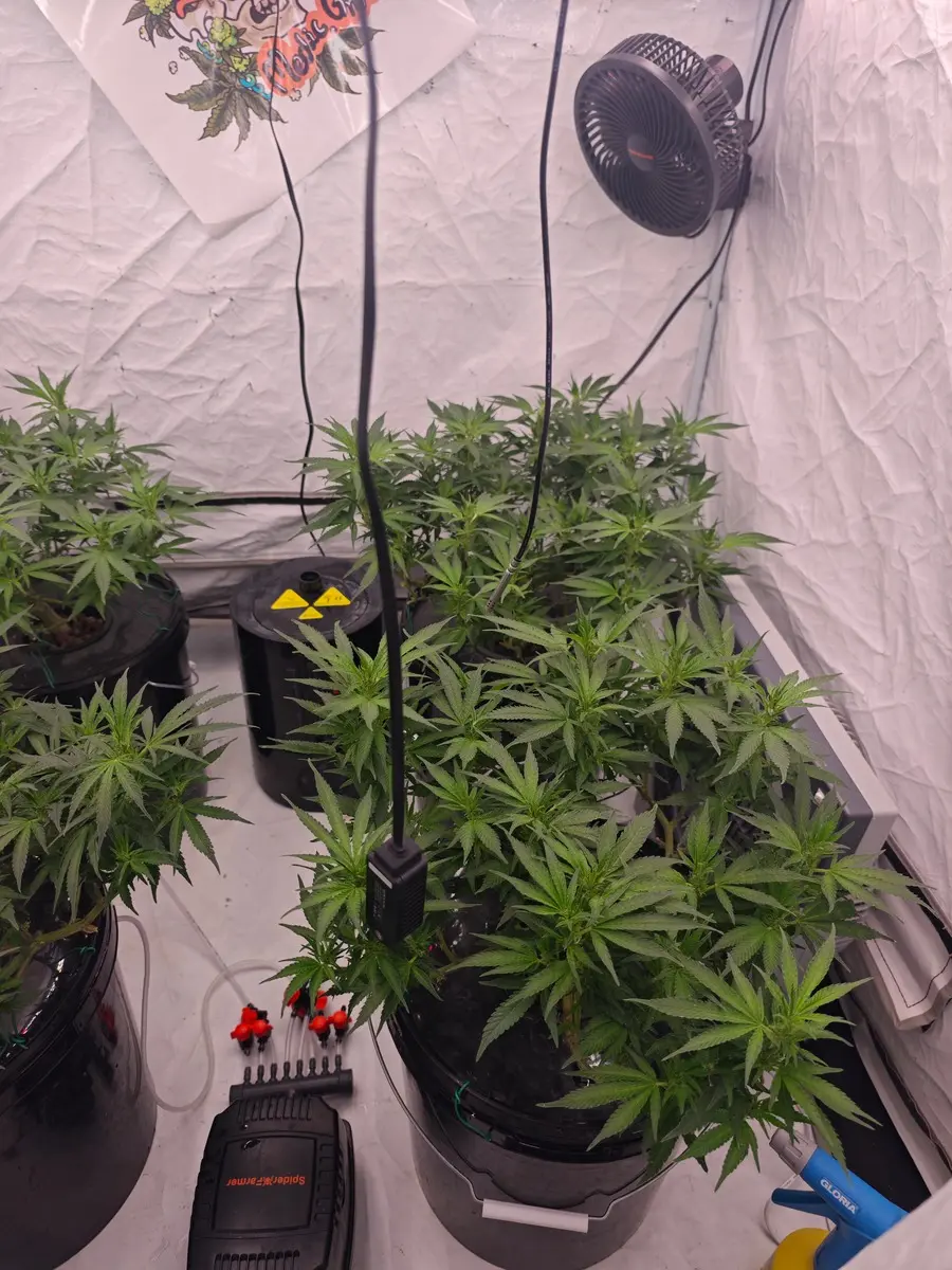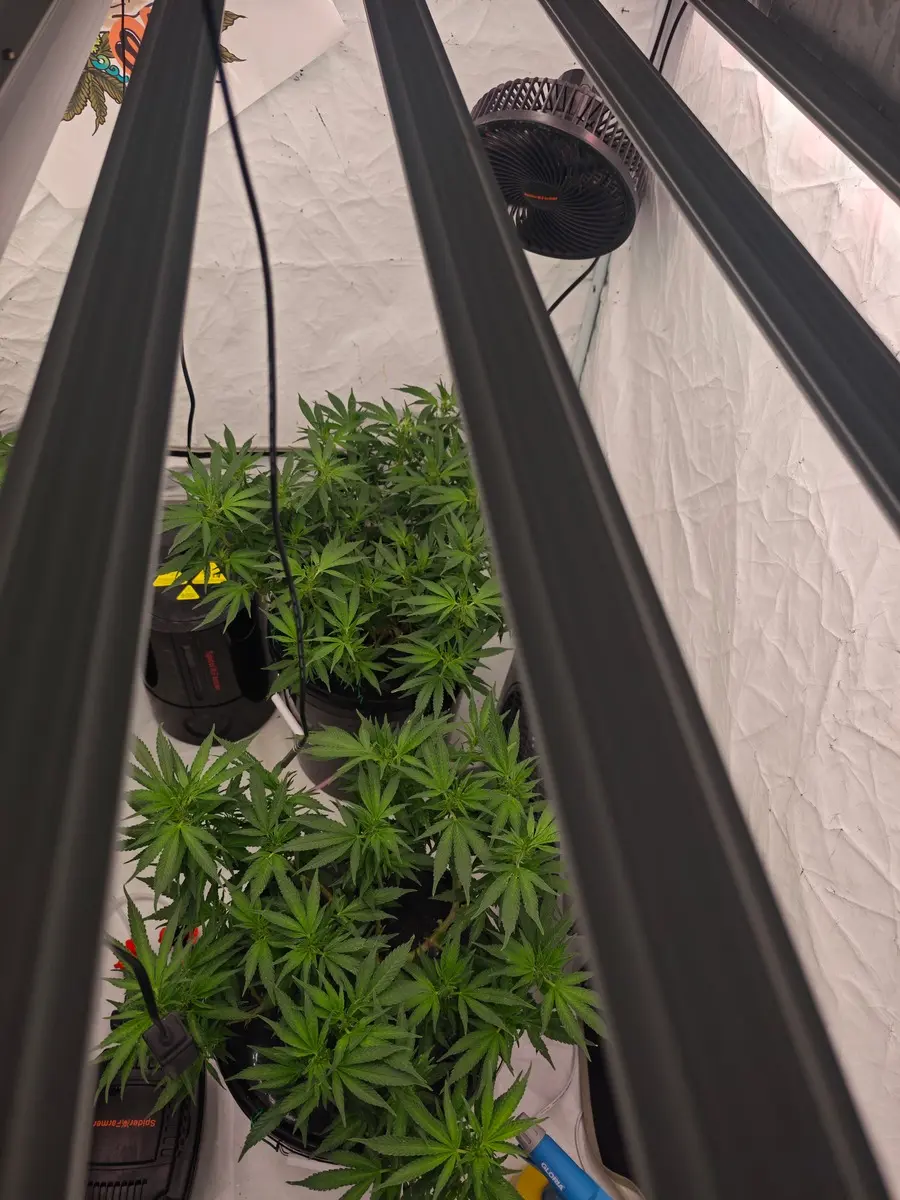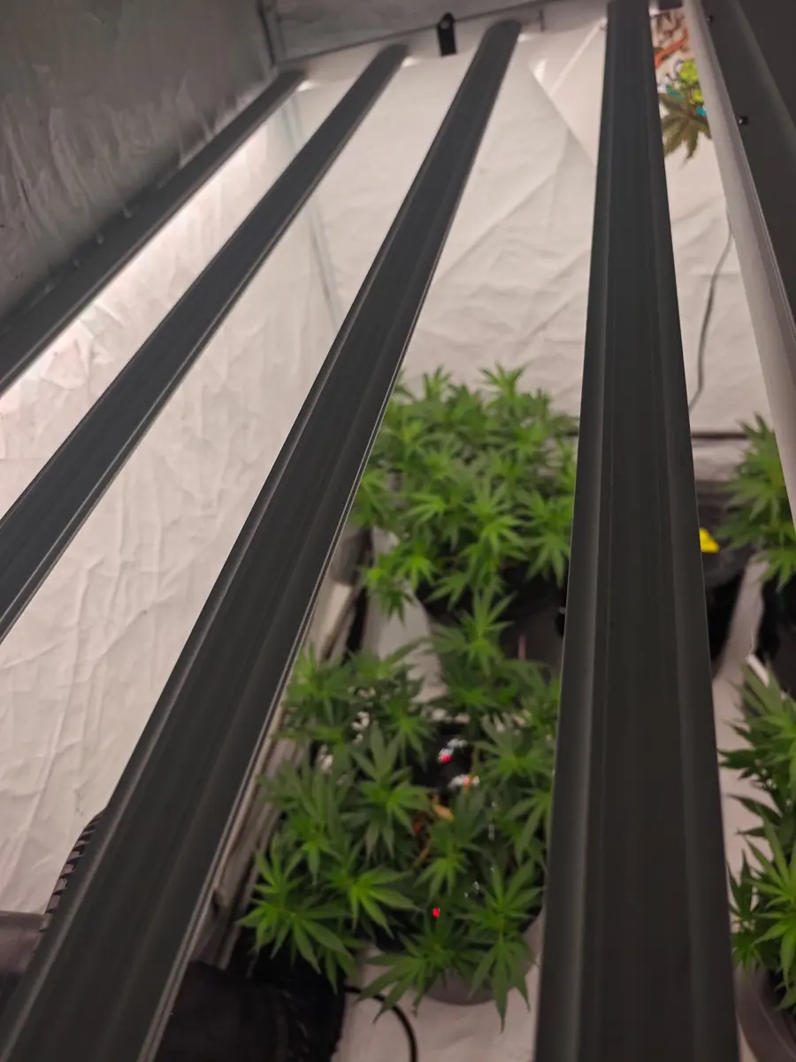 Unter einer Grow Medic Led Lampe, regelbar in 25 er Schritten bis maximal 760 Watt. Desweiteren 2 neue Umluft venti von Spiderfarmer. Spiderfarmer Befeuchter mit Sensor. Ebenso ein Umluftventi für unterm Blätterdach. Abluft kam ebenso neu, Prima Klima 800 , 150mm , mit Temperaturregler. Hab jetzt mal ein wenig Geld in die Hand genommen , muss ja sein. Eigentlich sollten die Mädels in einer 80*80 * 160 stehen , wurde aber viel zu eng .