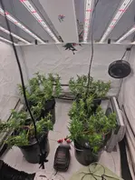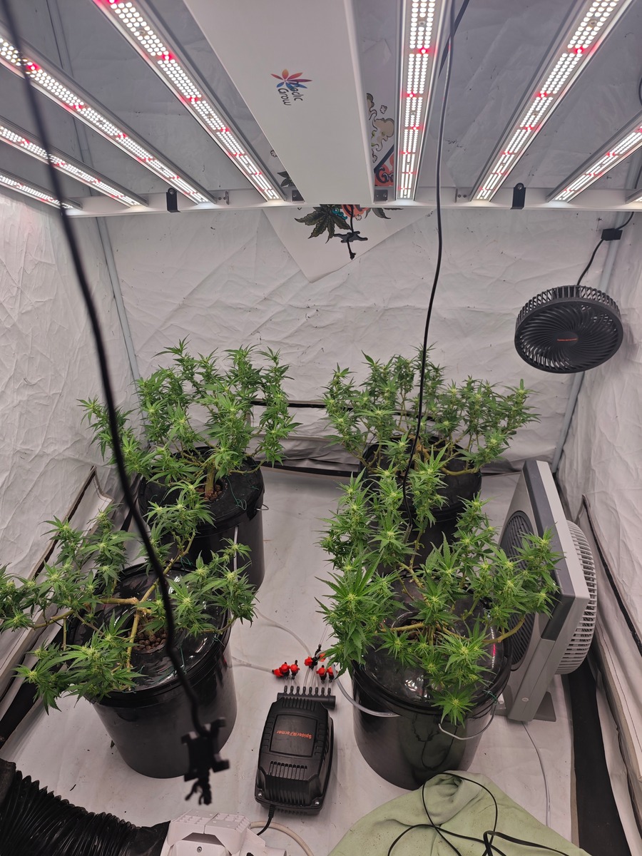 Unter einer Grow Medic Led Lampe, regelbar in 25 er Schritten bis maximal 760 Watt. Desweiteren 2 neue Umluft venti von Spiderfarmer. Spiderfarmer Befeuchter mit Sensor. Ebenso ein Umluftventi für unterm Blätterdach. Abluft kam ebenso neu, Prima Klima 800 , 150mm , mit Temperaturregler. Hab jetzt mal ein wenig Geld in die Hand genommen , muss ja sein. Eigentlich sollten die Mädels in einer 80*80 * 160 stehen , wurde aber viel zu eng .