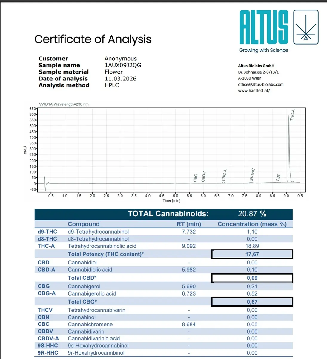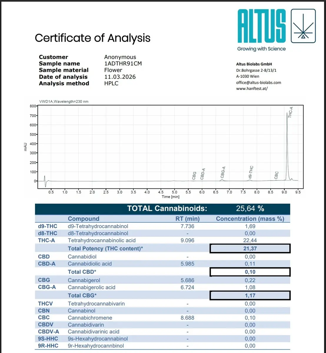 Die gemessenen THC-Werte der Proben lagen über dem Durchschnitt; Werte von über 20 % sind vergleichsweise selten. Die optische Qualität der Blüten war insgesamt gut. Auf Grundlage des CBG-A-Gehalts sowie der Trichomentwicklung lässt sich darauf schließen, dass der Erntezeitpunkt angemessen gewählt wurde. Insgesamt wirkt der Anbau sehr gelungen.