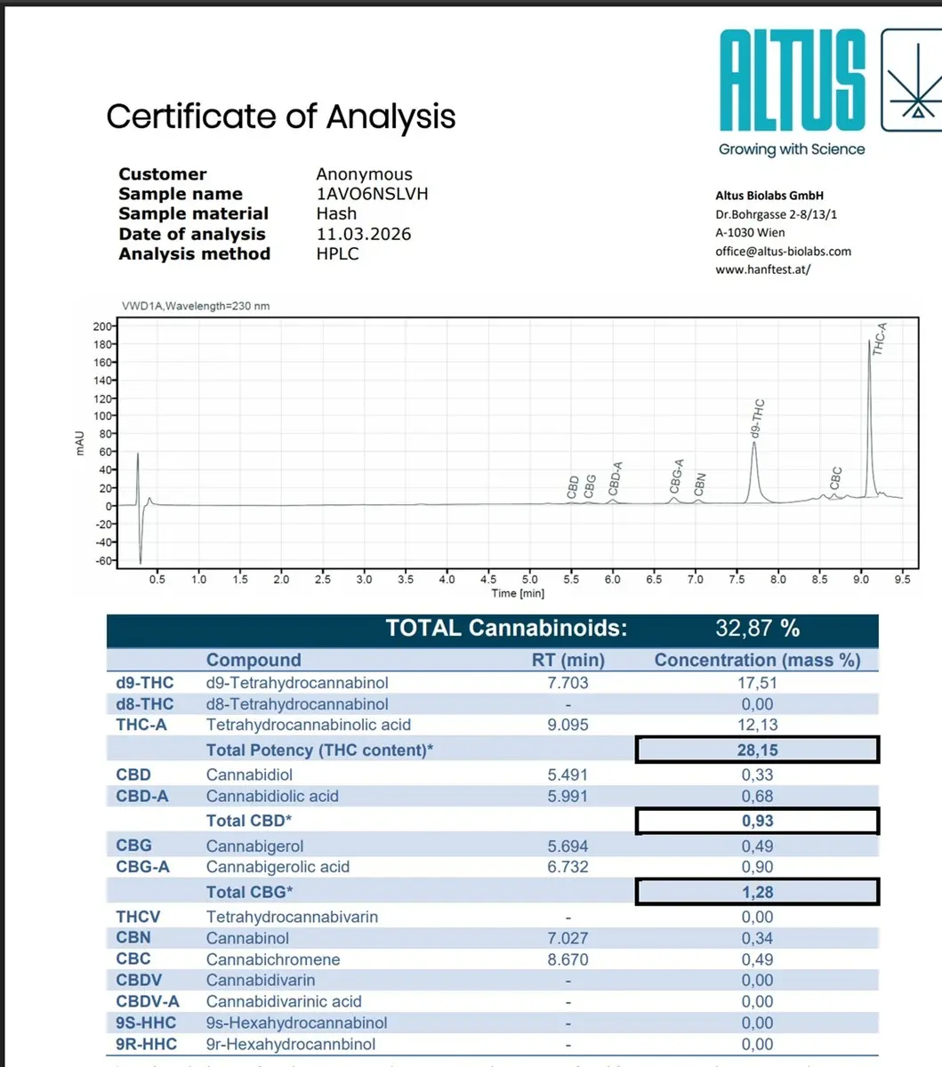 Beim Haschisch ist zudem durch Wärmeeinwirkung ein Teil des THC zu CBN umgewandelt worden. Dieser Prozess ist jedoch normal und tritt häufig auf.