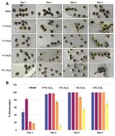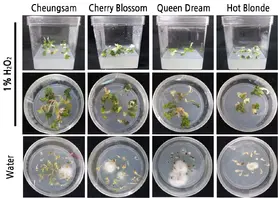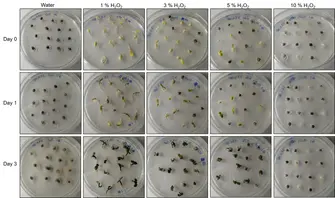 Ja. Das Video beginnt mit einer Flasche Flächendesinfektionsmittel. Anschließend werden Wasserstoffperoxid und destilliertes Wasser gezeigt. Zweimal werden je 20 ml destilliertes Wasser in das Glas gegeben, gefolgt von einer 20 ml Dosis 3% Wasserstoffperoxid. Dies entspricht einer Gesamtkonzentration von 1%. Studien zeigen, dass höhere Konzentrationen von Wasserstoffperoxid die Keimungsrate und die Trieblänge verbessern, aber die Überlebensrate verringern können. Eine Konzentration von 1% ist für diese Methode optimal. Sie eignet sich hervorragend zur Desinfektion.