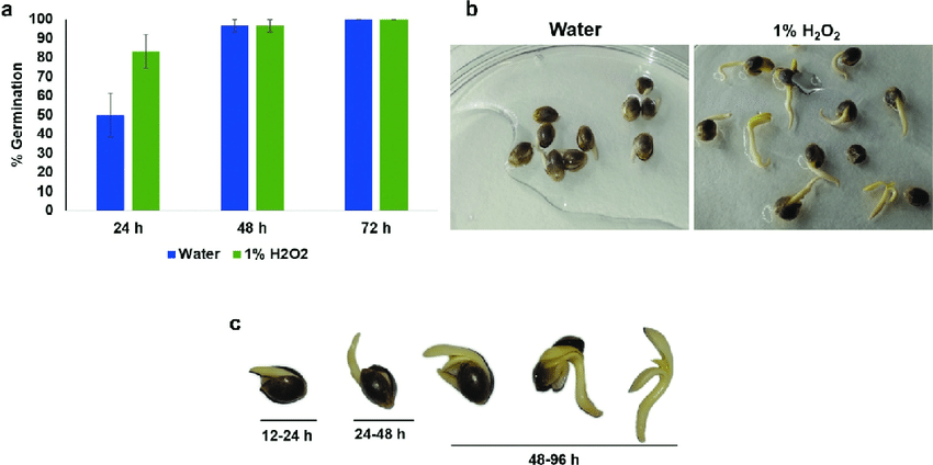 "In our experiments, 1% H2O2 acts best as liquid germination media, as it significantly enhances germination and survival rates while also reducing contamination rates." - Availability of Hydrogen Peroxide Solutions as a Germination Liquid Medium for Contamination-free in vitro Seedling Development of Cannabis sativa