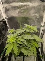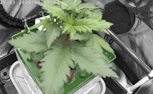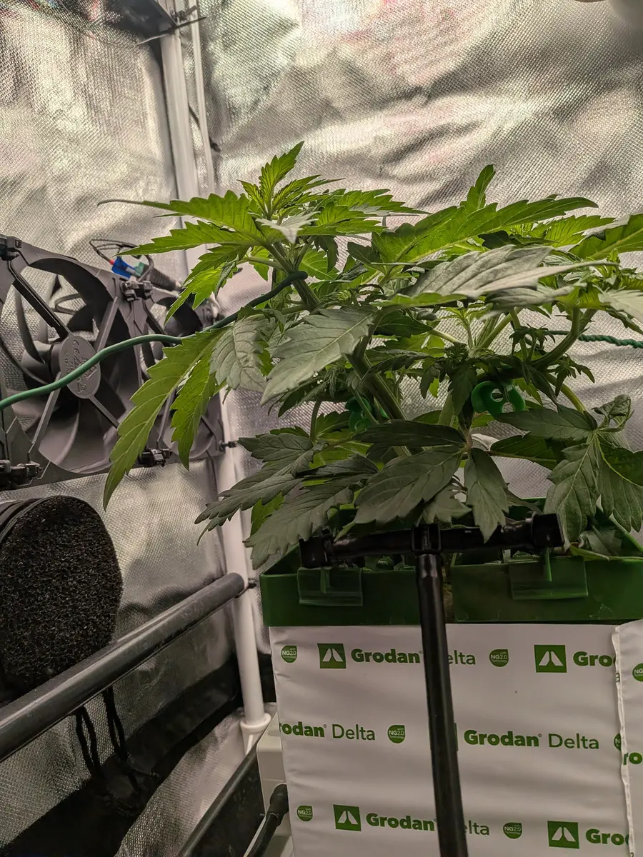 Nach der Keimung habe ich die Pflanzen direkt an hohe EC-Werte, niedrige RLF und Wind gewöhnt. Nach etwa 14 Tagen waren sie gut abgehärtet. Dann stand die erste Entscheidung an: direkt in die Blüte oder toppen? Ich habe mich fürs Toppen entschieden und zwei Nodien stehen gelassen, um den Wurzeln Zeit zu geben, den großen Hugo-Block (15 × 15 cm) vollständig zu durchwurzeln. Eine Woche später wurde geflippt.