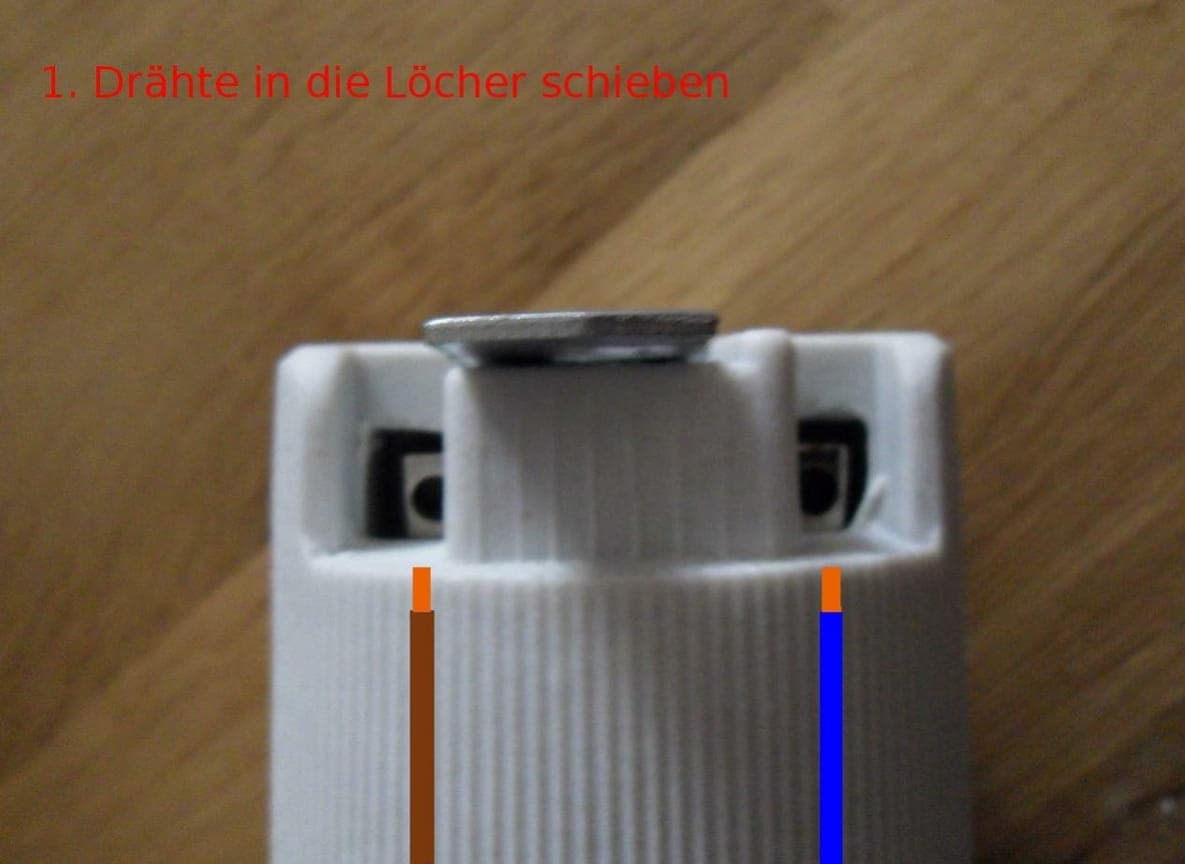 anzumerken wäre noch, das man Kabel mit einen Mindestdurchmesser von 1,5mm verwenden sollte und wer keine Aderendhülsen zur Hand hat kann die Kabelenden auch verlöten ;)