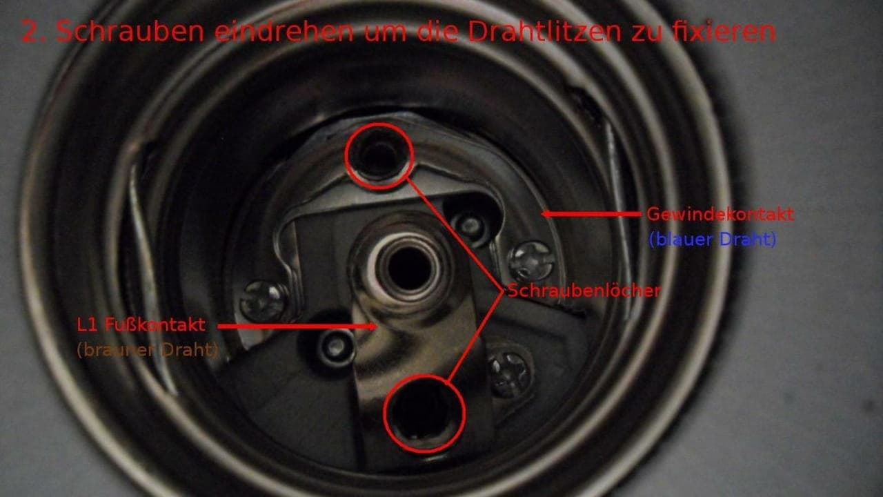 • Verkabelung an Lampe / Fassung anbringen, die Erdung muss i.d.R. an der Armatur selbst angebracht werden. (danke für die Fotos an Flow!)