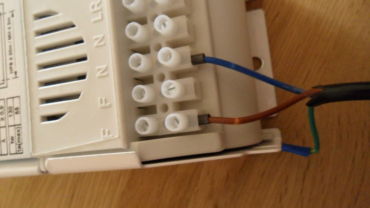 • Verbindungskabel zwischen [lexicon]VSG[/lexicon] und Lampe an Vorschaltgerät anschließen (auf dem Foto gehen die drei Adern links zum Netzstecker, die rechten zur Lampe)