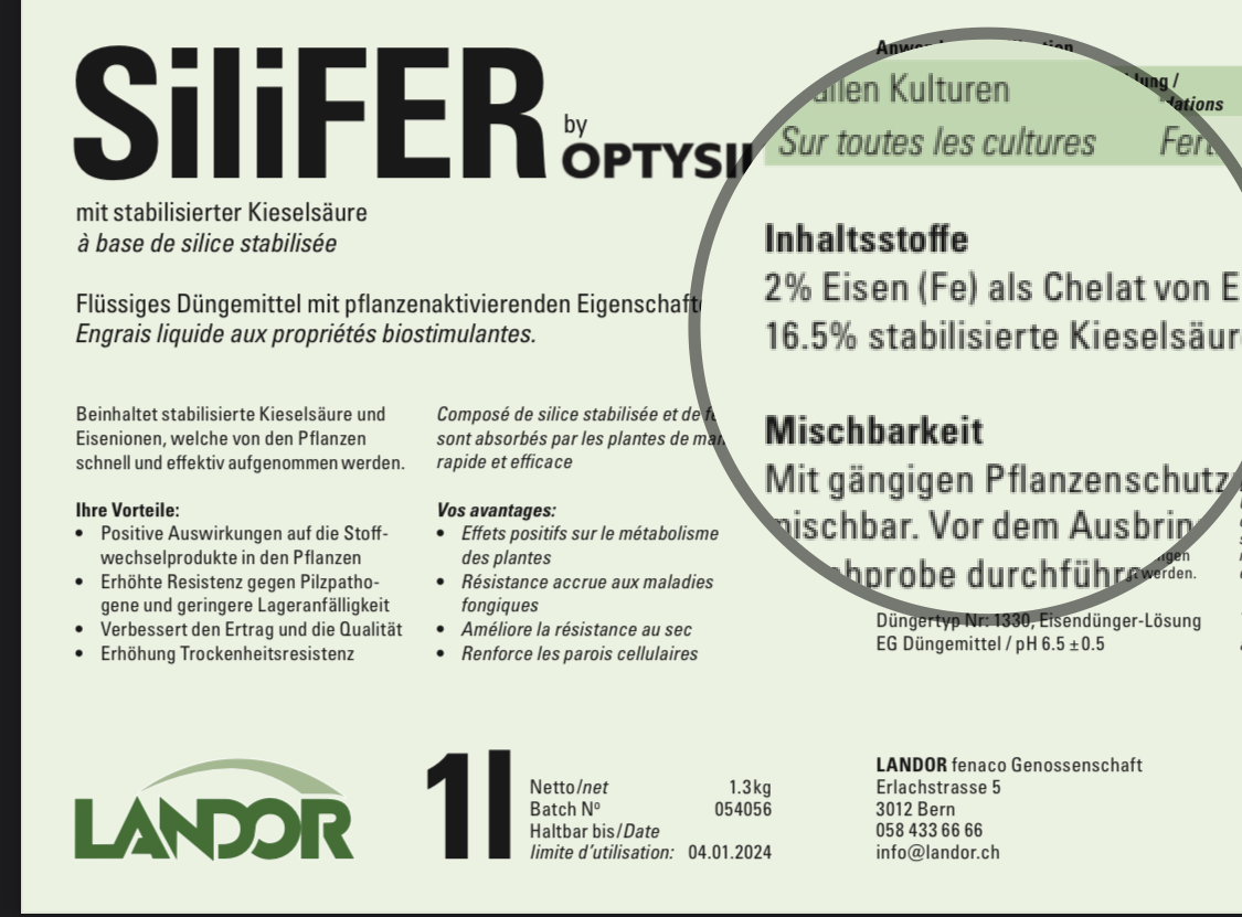 Eine Herausforderung für die Hersteller von flüssigen Kiesel-säure-Produkten ist die Stabilisierung der Kieselsäure. Ohne Stabilisator kondensiert diese bei neutralem pH und flockt aus. Pflanzenverfügbarkeit und Wirkung sind damit verloren. Manche Hersteller stabilisieren die Kieselsäure bei einem sehr hohen pH von 10 bis 12. Solche Produkte sind kaum kompatibel mit üblichen Tankmischungen mit einem pH von 5 bis 7. Andere Produkte, wie beispielsweise SiliFER, haben einen neutralen oder leicht sauren pH und sind mischbar mit Pflanzenschutzmitteln und anderen Düngern. Diese Produkte enthalten einen chemischen Stabilisator wie zum Beispiel Polyethylenglycol (PEG), Eisenchelat EDTA oder Cholinchlorid (nicht zugelassen in der Schweiz).