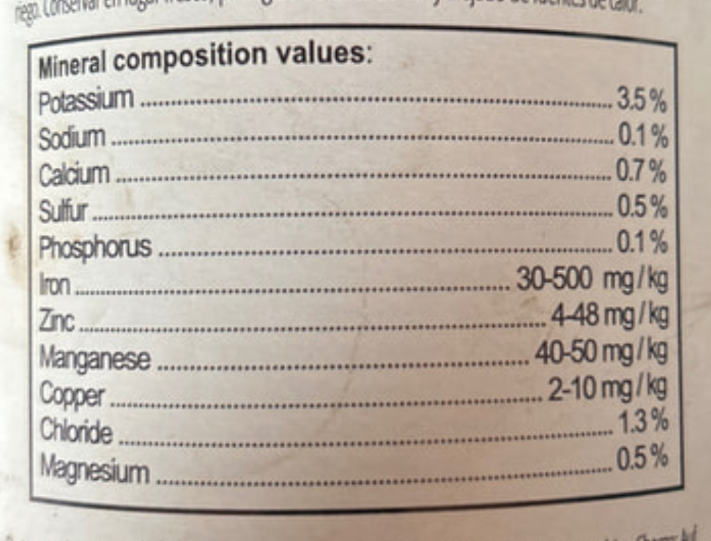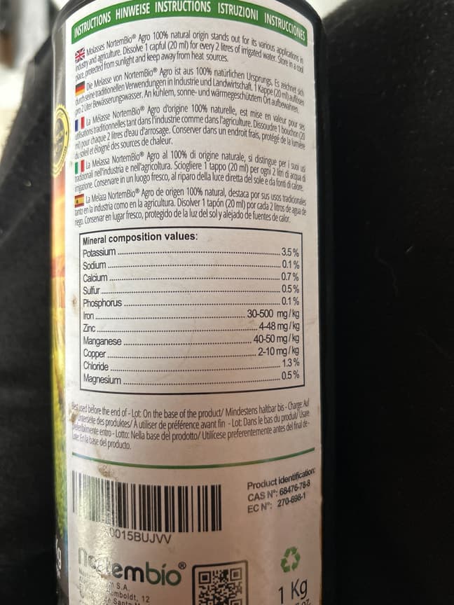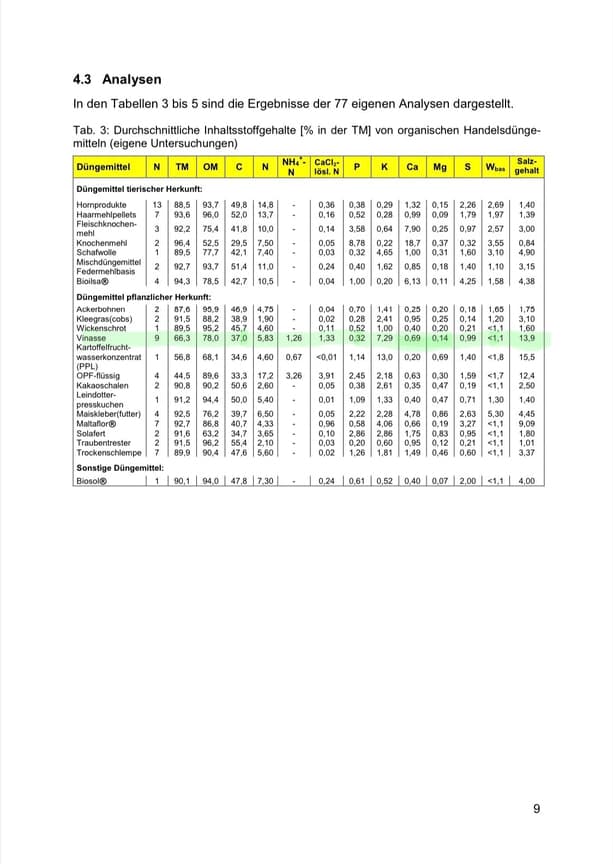 Also, das ist nicht Vinasse, sondern Blackstrap Molasse. Die ist bisschen anders zusammengesetzt und ich find auf die Schnelle nicht, wieviel Stickstoff und Phosphor da drin stecken.