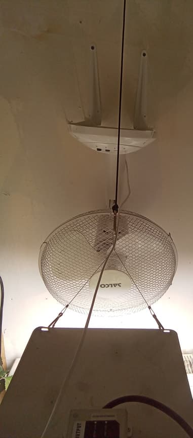 Pro Blütekamer ein Boxventilator, per Reihenschaltung runtergeregelt.