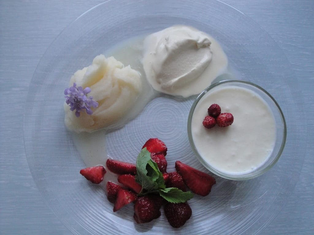 5. Gang: Tannenspitzen-Sorbet, Waldmeister-Mascarpone-Creme, Holunderblüten-Eis und marinierte Erdbeeren