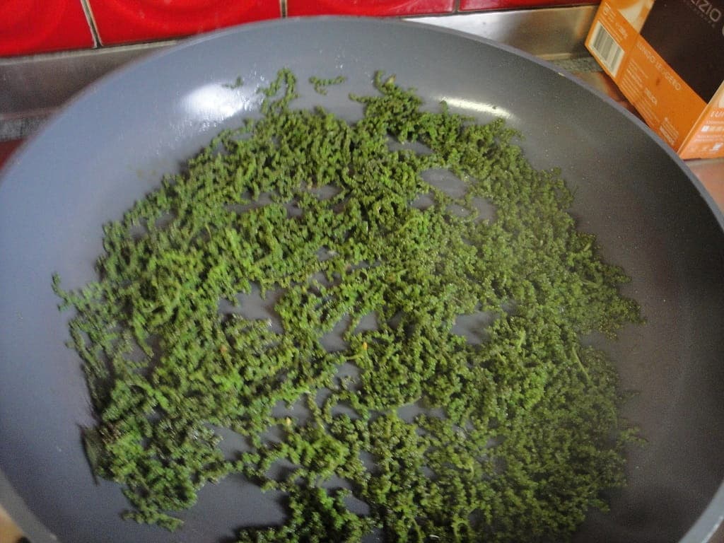 Die Brennesselsamen brate ich im Olivenöl und mit Salz kross an, restliche Zutaten schnibbeln