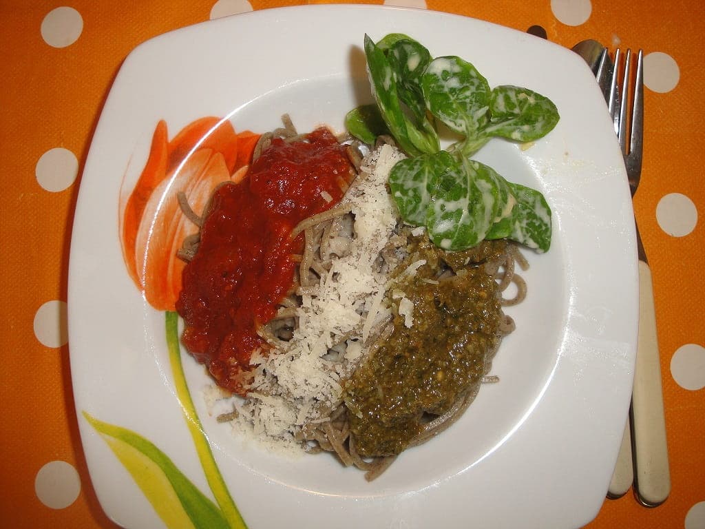 - die Paste mit Knoblauch, Parmesan und Nüssen (Pinienkerne, Walnüsse, Pekannüsse) zu einer herrlichen Pesto für eure Teigwaren mixen!