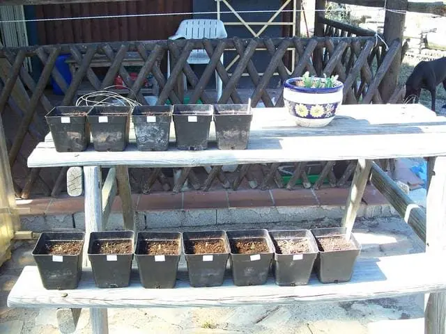 Auf der Bank noch 7x Tomate Elba Töpfe, aber auch ein Topf mit 2 und einer sogar mit 4 Sämlingen drin lol....