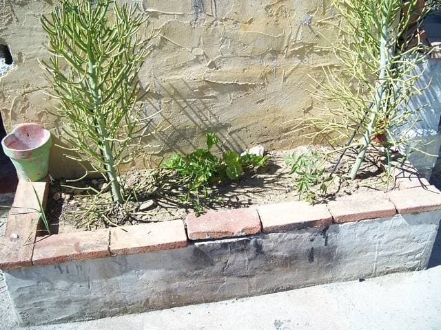 Das ist das einzige Beet das bepflanzt wurde, und auch nur weils fast wie ein Topf funktioniert und ich in der Mitte noch den fetten rest vom Stamm einer Hanfpflanze die da wohl mal wuchs Entdeckt hatte und mir dachte so schlecht kanns Gemüse da nicht Wachsen.... Die beiden Seltsamen bäumchen, waren schon da drinne....