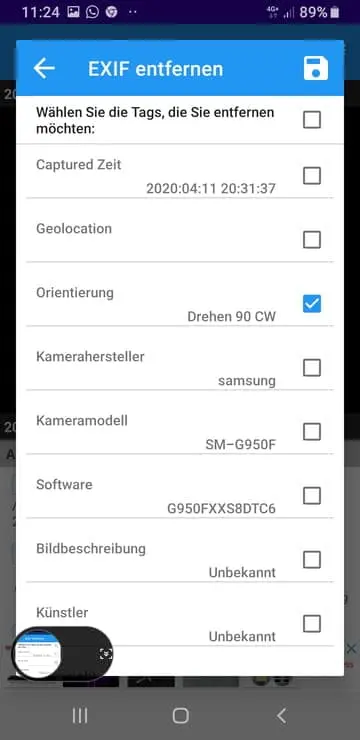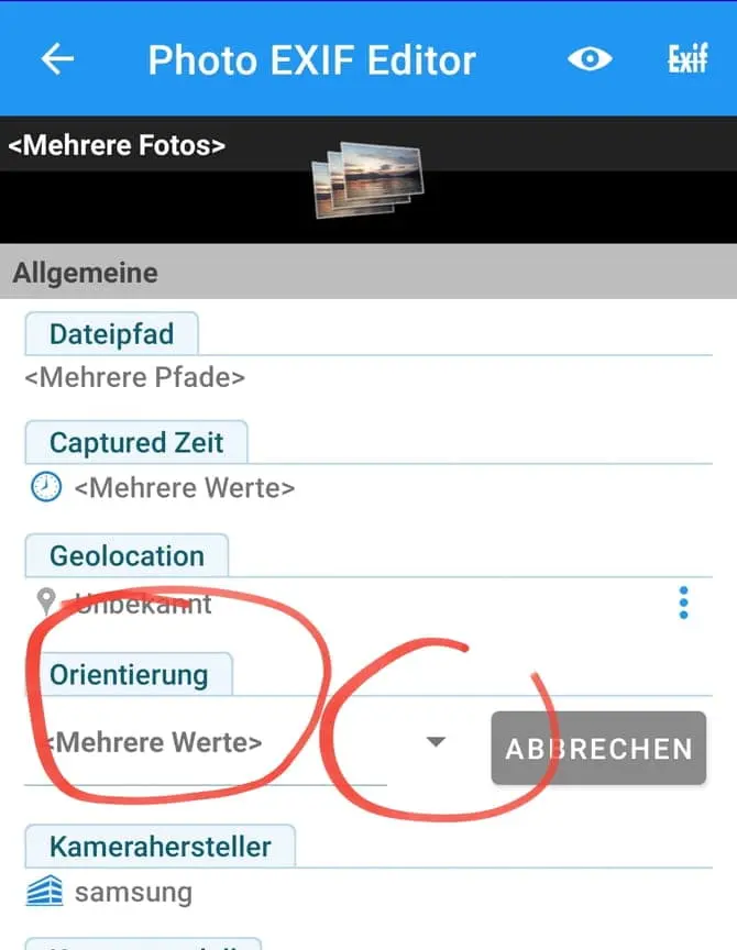 In der app unter exif oben rechts kommst ins menu, dort kannst orientierung entfernen
