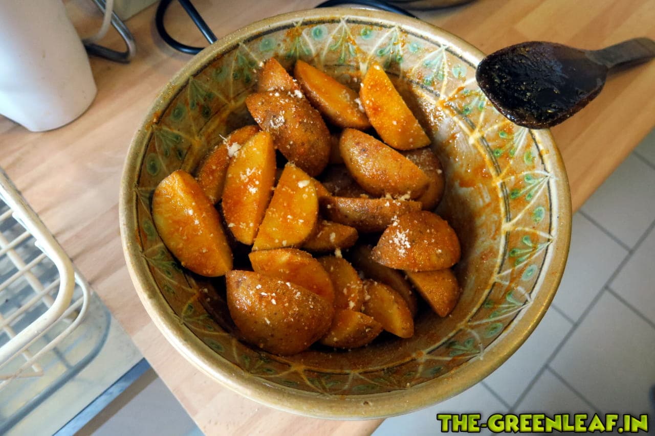 Die Marinade besteht aus geriebenem Parmesan, Knobi, Salz, Paprika, Walnussöl.![]()