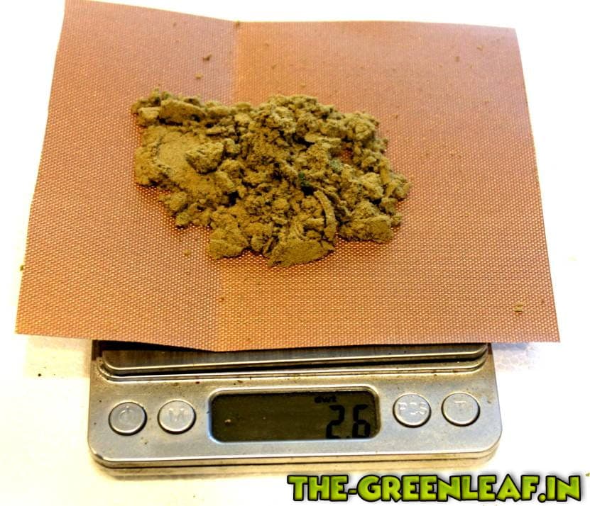 Bild 1 Zeigt das Sieb und darauf eine Schale mit ca.25g zerkleinerten Weedresten // Bild 2 = Mischung + ca. 30g Trockeneispellets (4-6mm)