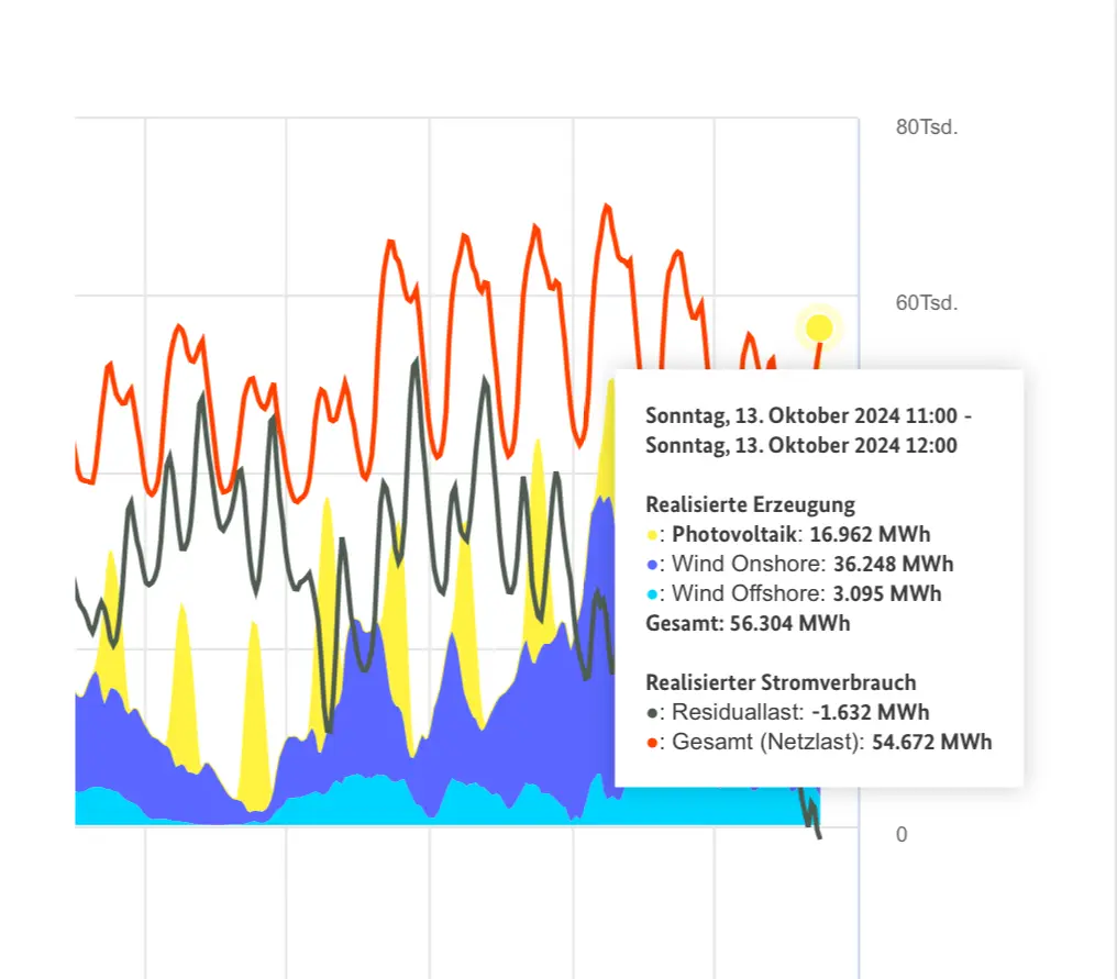Auf SMARD wird die Residuallast berechnet als der Stromverbrauch, abzüglich der Erzeugung von Photovoltaik- und Windkraftanlagen. Im Tagesverlauf kommt es, je nach Höhe der Einspeisung durch Erneuerbare, zu Schwankungen der Residuallast. Ist sie Null oder gar negativ, konnte der Strombedarf komplett durch die Erzeugung aus Wind und Sonne gedeckt werden.