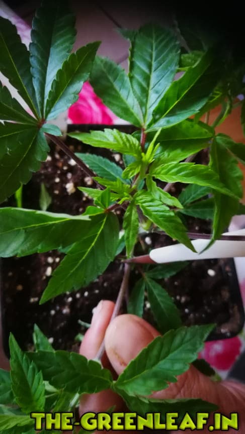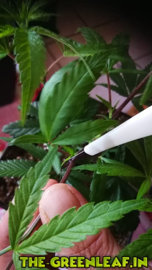 Schneidet zwischen 2 Internodien ( knapp oberhalb der Letzten Internodie die ihr stehen lässt ). Im 45 Grad Winkel schneiden.