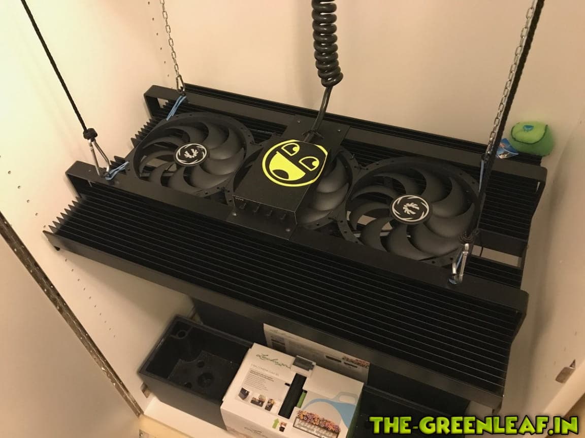 Habe die billig LEDs mit einem Rahmen montiert. Die Zuluft sollte soweit auch passen denn soweit ich das erkennen konnte produzieren die Dinger nicht abnormal viel Hitze. Ich habe die beiden Lampen per Daisy Chain verbunden, was auch tadellos funktioniert. Erspart mir halt ein Kabel und macht eine Stromquelle frei. Ich kann die Lampen insgesamt in 4 Stufen betreiben von ~75W bis ~300W. Mit dem Stromkabel muss ich mir noch was überlegen. Das sieht so nicht wirklich schick aus. Ich werden den 3D Drucker mal fragen :D