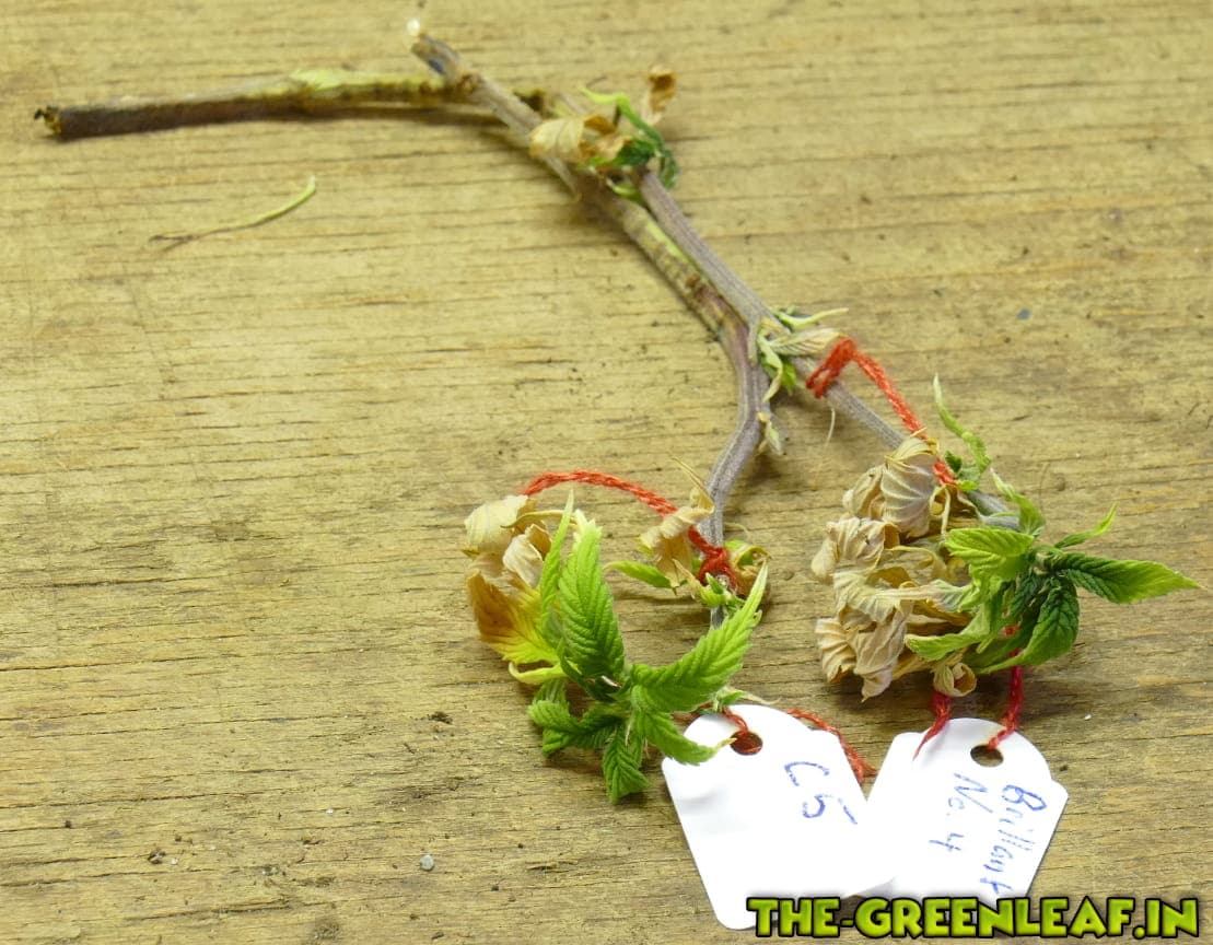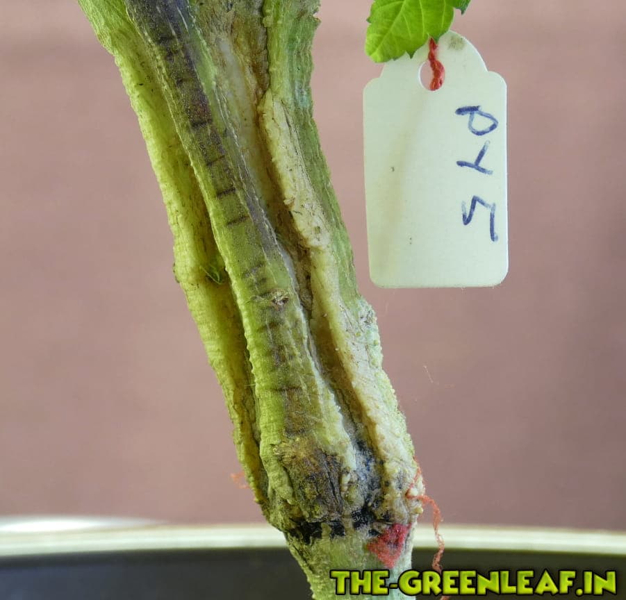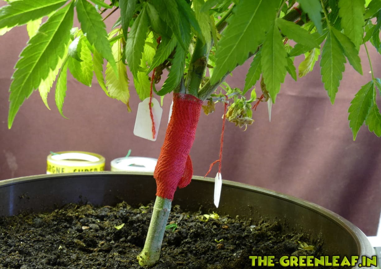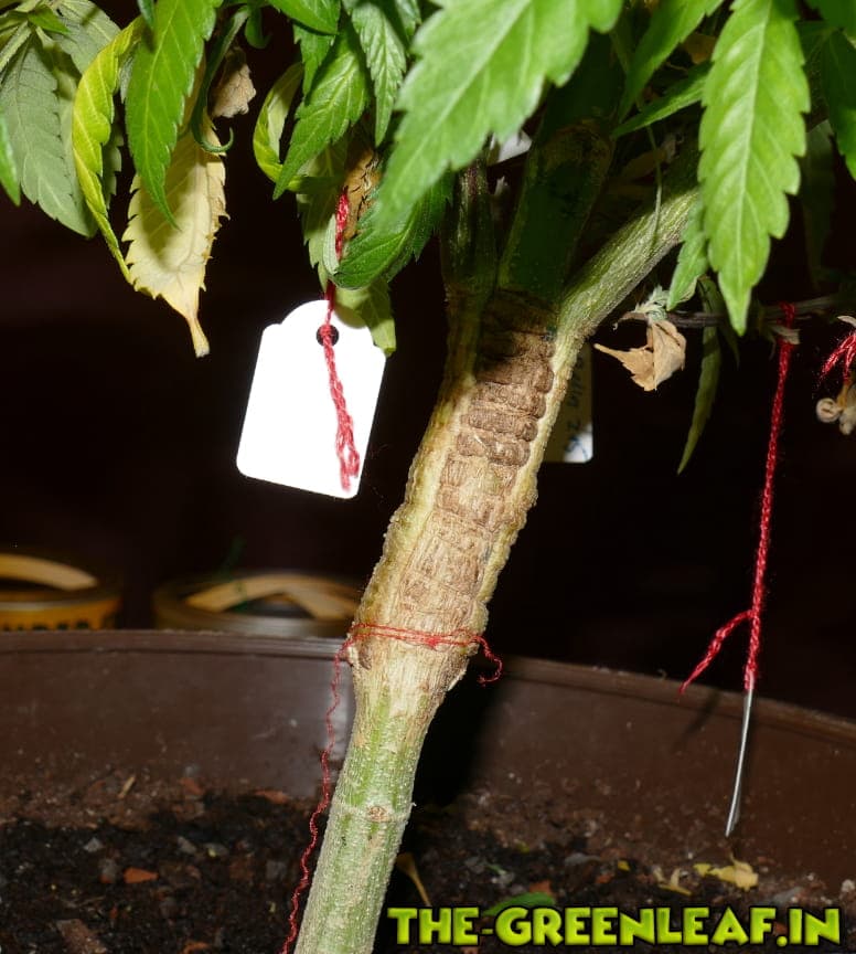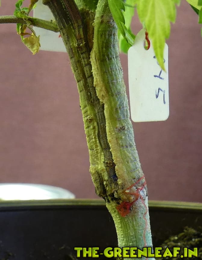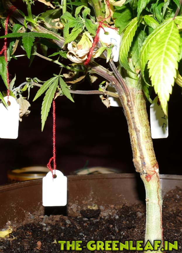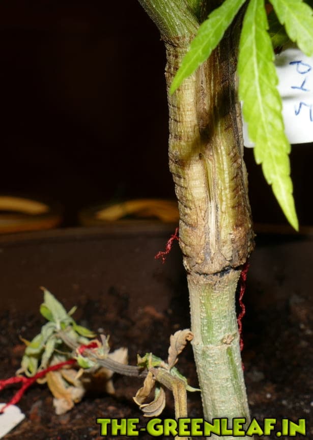 Wie weiter vorne schon geschrieben, hat die für MuMu3 angewendete Methode, alle Pfropfe auf gleicher Höhe rund um den Stamm der Unterlage herum anzusetzen, nicht wirklich überzeugen können. Zudem konnte man seit Beginn sehen, dass die 5 Pfropfe ganz unterschiedlich vital sind, auf gut deutsch: dreien gehts gut und zwei kacken ab.