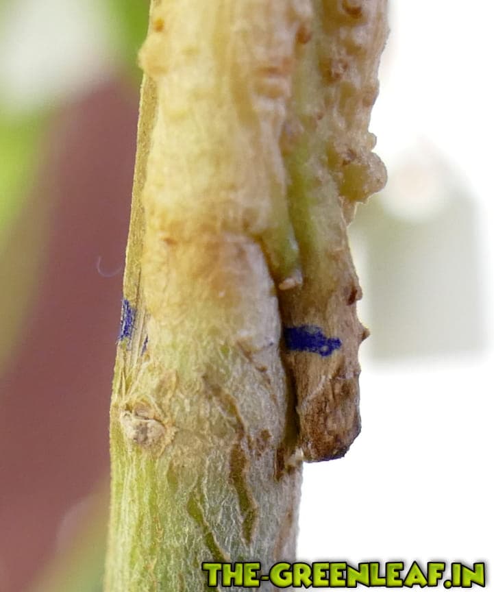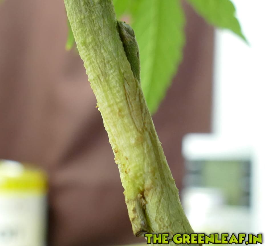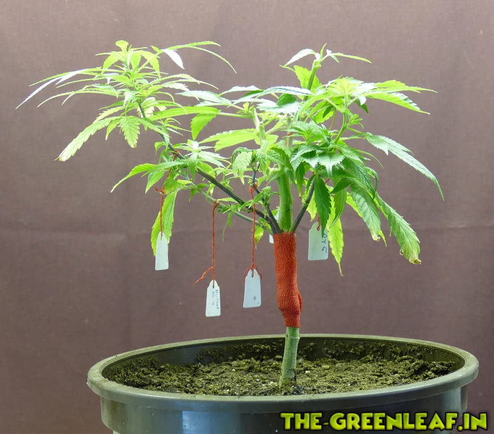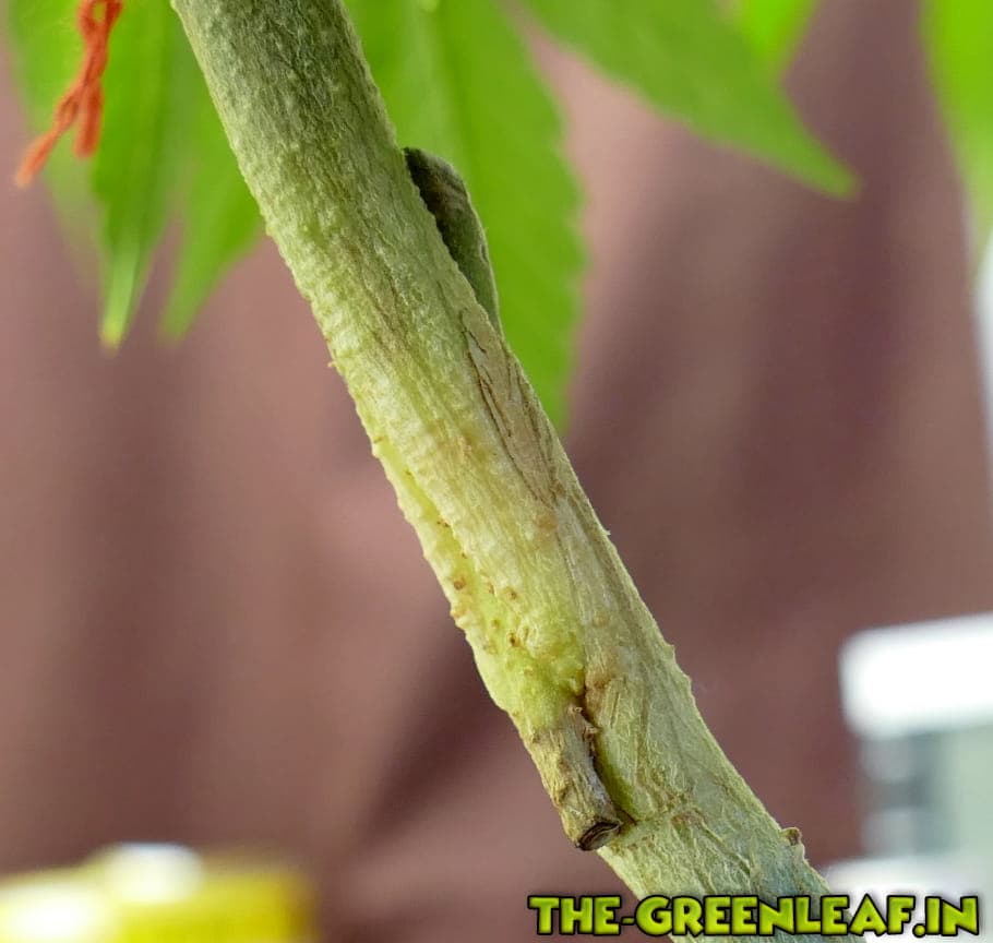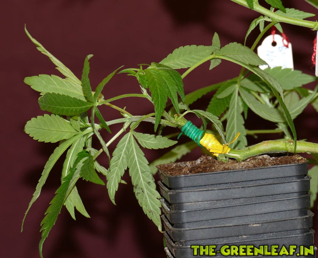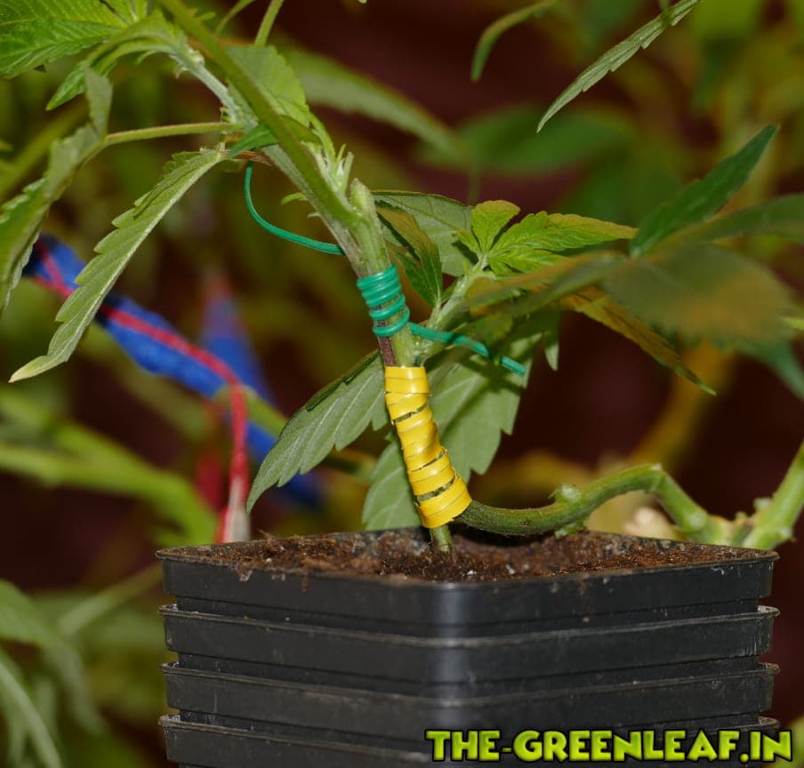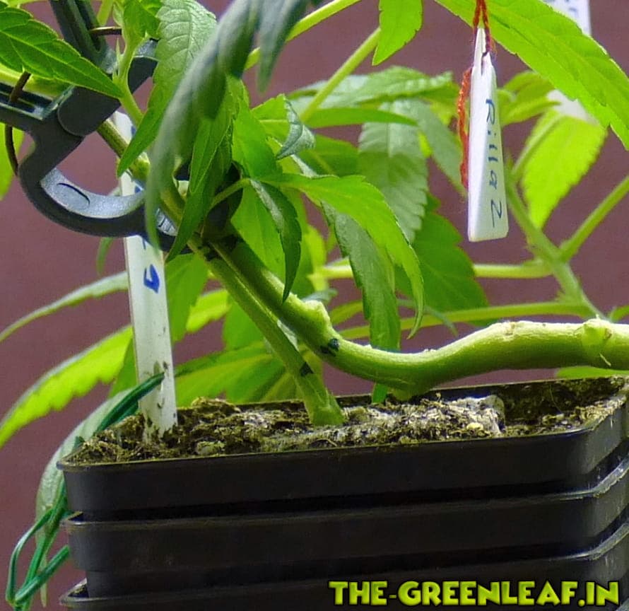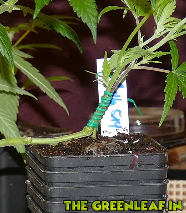 Eine Multistrain-Mutti, jederzeit 4, 8, oder 1x "Lieblingsstrains" verfügbar zu haben, aber nur eine Pflanze versorgen zu müssen das hat schon etwas, wenn es denn mit erträglichem Aufwand und "narrensicher" zu erreichen wäre. Problem ist, dass sich Hanf nur sehr schwer herkömmlich pfropfen lässt, das heisst, dass ein abgeschnittener Trieb an einen anderen Zweig angesetzt wird und mit diesem verwächst, weil der Pfropf (das Reis) kaum die Zeit lässt bis die Schnittstelle soweit verwachsen ist, dass sie das angesetzte Stück ernähren kann bevor er schlapp macht und vertrocknet. Dagegen hilft, den Pfropf erst abzuschneiden, wenn die beiden Zweige bereits miteinander verwachsen sind, das geht nämlich ganz leicht und das ist die gute Nachricht.
