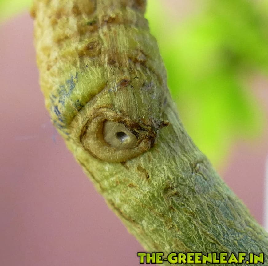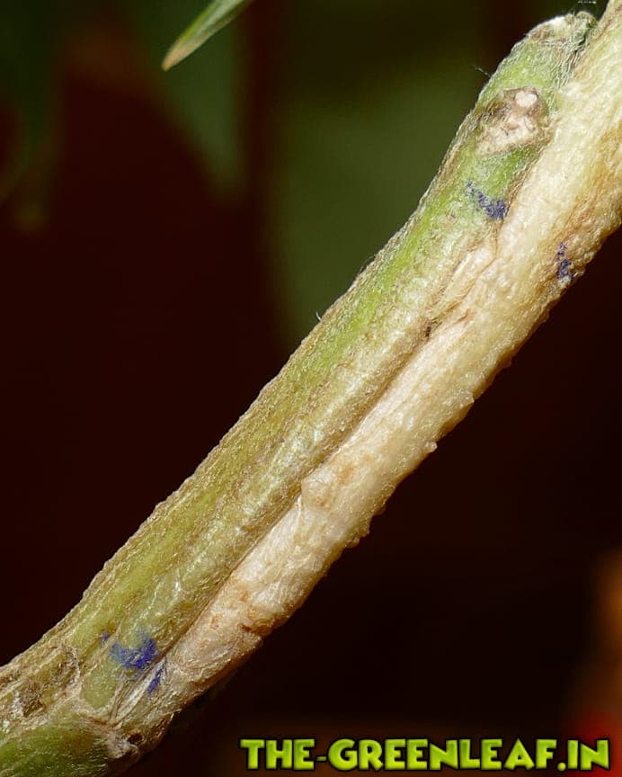 nach dem Anzeichnen der vorgesehenen Verbindungsstelle wird dort mit dem Skalpell von beiden Zweigen ein wenig abgenommen und alles wieder positioniert.![]()