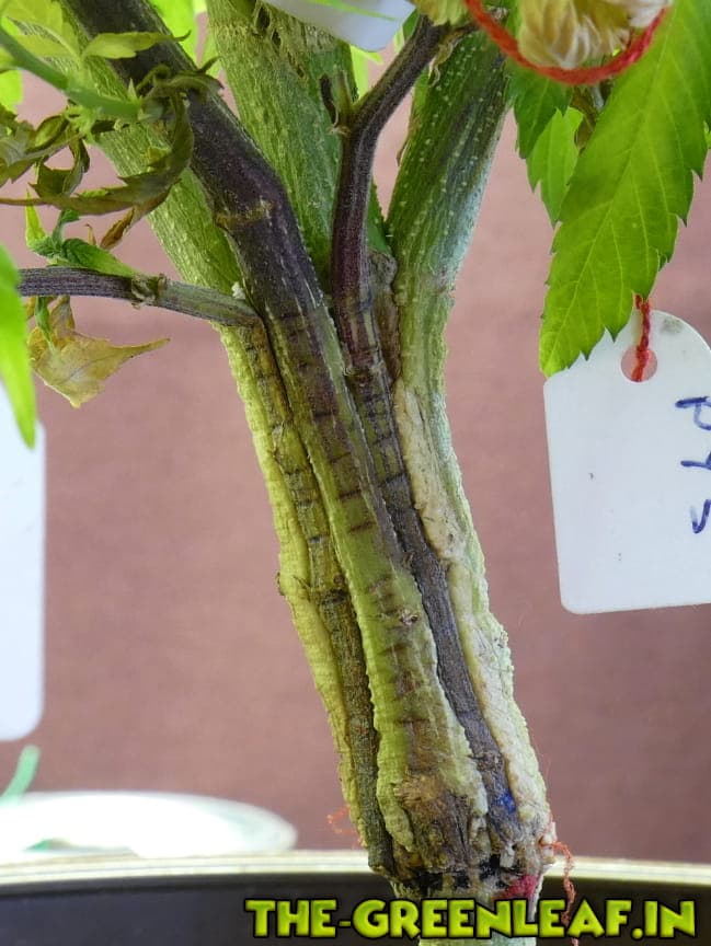 Wie weiter vorne schon geschrieben, hat die für MuMu3 angewendete Methode, alle Pfropfe auf gleicher Höhe rund um den Stamm der Unterlage herum anzusetzen, nicht wirklich überzeugen können. Zudem konnte man seit Beginn sehen, dass die 5 Pfropfe ganz unterschiedlich vital sind, auf gut deutsch: dreien gehts gut und zwei kacken ab.
