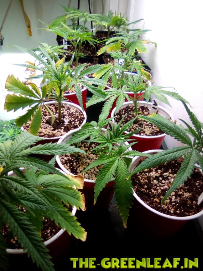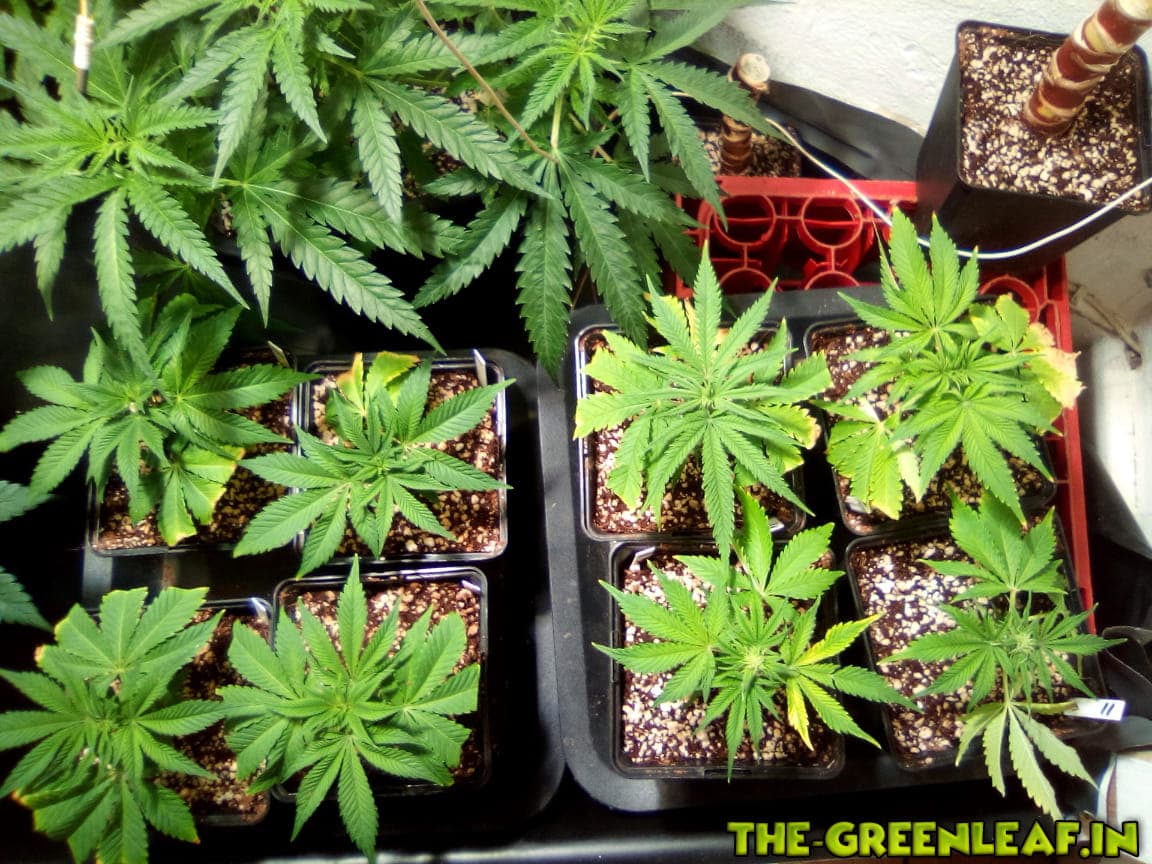 Die Stecklinge wurden in kleine Töpfe mit Coco-Perlit verfrachtet und das erste mal sehr sanft gedüngt, 2 Stecker hatten gestern an Tag 14 nach dem Schneiden noch keinen festen Halt im EZ Plug und wurden geopfert. Auffällig ist, dass die 4 Stecklinge von der mutierten Pflanze durchweg am besten gewurzelt hatten und auch schon kräftig am wachsen sind. (Besagte Mutterpflanze im Bild vorne links,daneben, also in der Mitte, ihre Stecker).