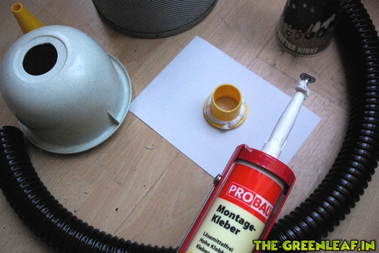 Schüssel nach entsprechender Trockenzeit oben auf den Turm setzten und wiederum mit PB verkleben. Nun mit einen Staubsaugerschlauch oder ein 1 1/2 Zoll Wasserschlauch das Mundstück und die Schüssel verbinden (passt genau auf die Tülle) und fertig ist die Laube!![]()
