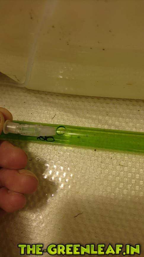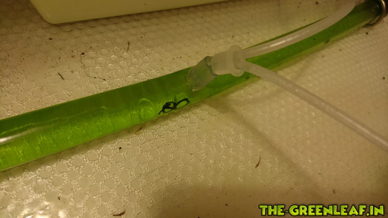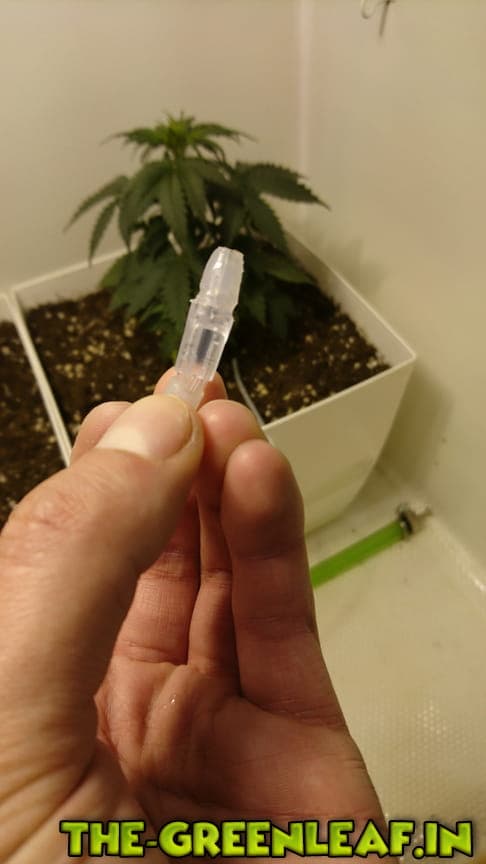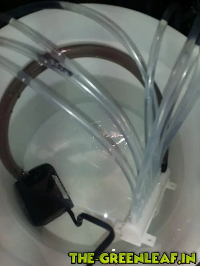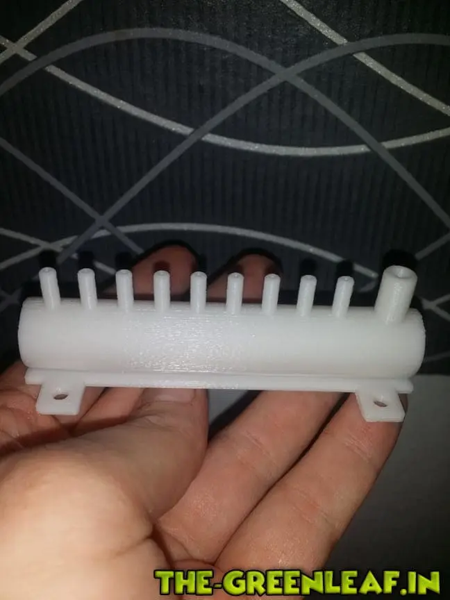 9 Ausgänge für Schläuche mit dem Innendurchmesser von 4 mm. Ich habe die Schläuche benutzt welche benutzt werden um DWC Sprudelsteine mit der Luftpumpe zu verbinden (Dimensionen 4 mm innen / 6 mm außen).