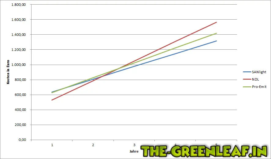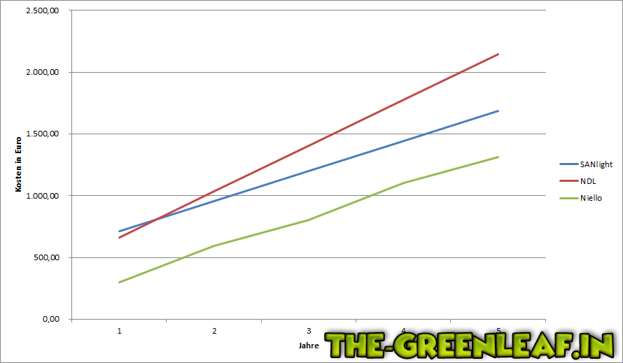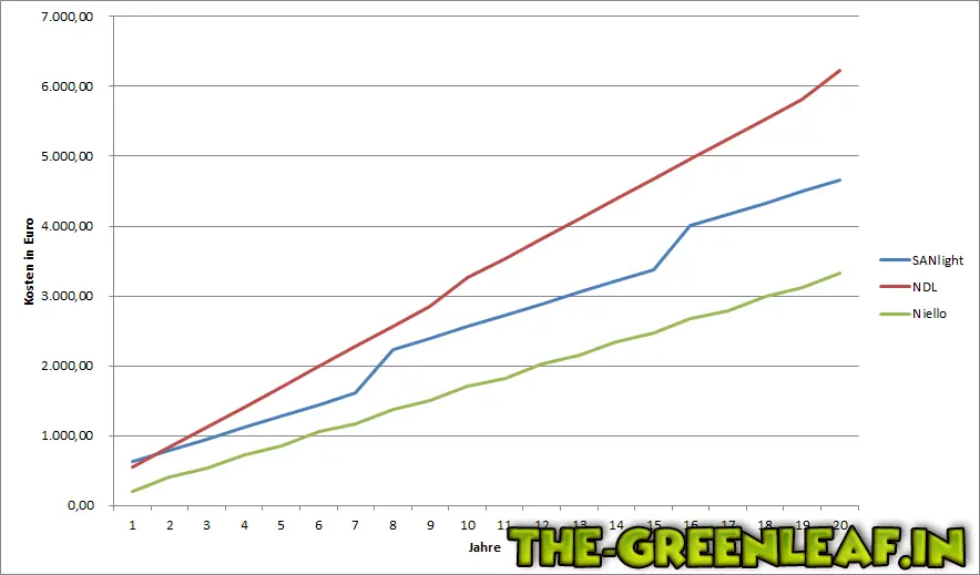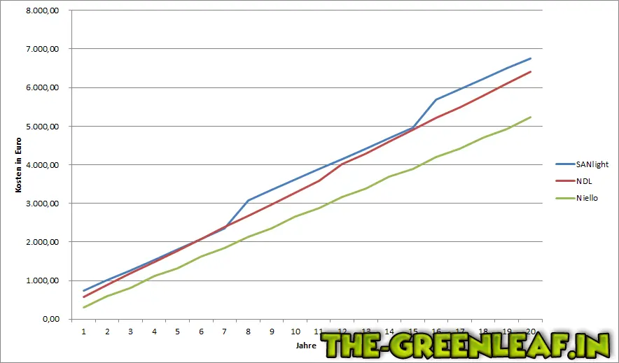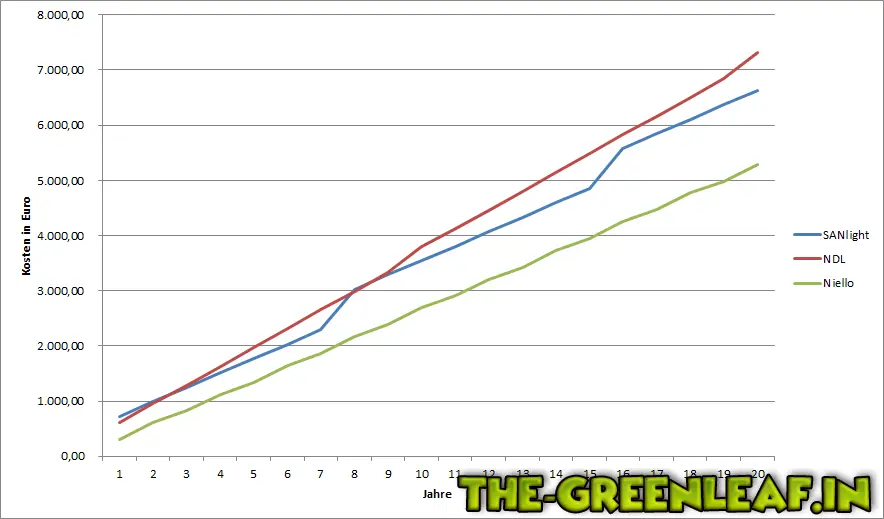 Des Weiteren ist die Lebenszeit der NDL auf 1 Jahr, der TLED auf 3 Jahre, die SANlight auf 8 Jahre und die Lebenszeit der Niello auf 2 Jahre gesetzt und die Neukäufe fliessen in den Berechnungen mit ein. Es wird immer wieder das gleiche Produkt für den momentanen Preis gekauft.