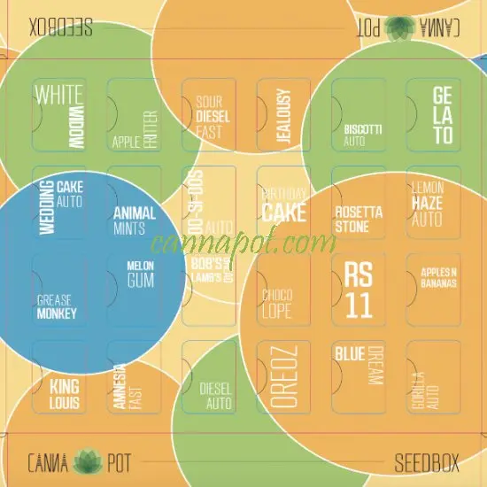 Die Cannapot Seedbox ist für echte Liebhaber von feminisierten Cannabissamen geeignet, die gerne eine große Vielfalt an Sorten für indoors und outdoors haben möchten. Der Samenmix beinhaltet gesamt 24 verschiedene Sorten mit je 2 feminisierten Samen, man bekommt also pro Cannabissorte immer 2 feminisierte Samen für die Sammlung...