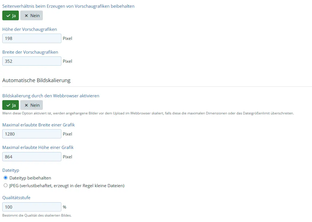 Die Bilder werden trotzdem vom Browser vor dem Upload auf die Maximale Höhe/Breite skaliert, darunter leider zwar noch immer bisschen die Qualität aber nicht mehr wie zuvor (eventuell sind hier morgen Anpassungen notwendig), da nicht mehr komprimiert wird (siehe Screenshot zur aktuellen Einstellung):