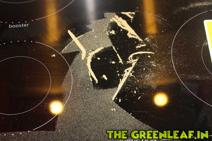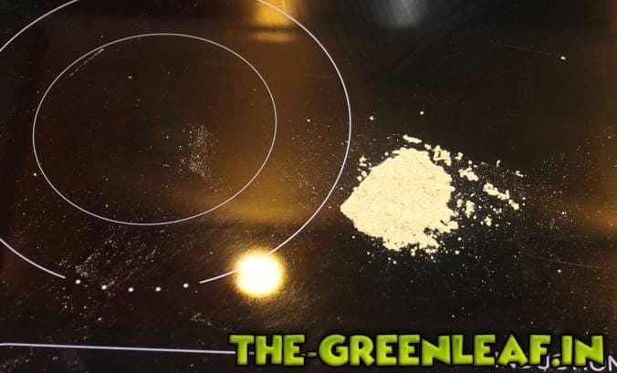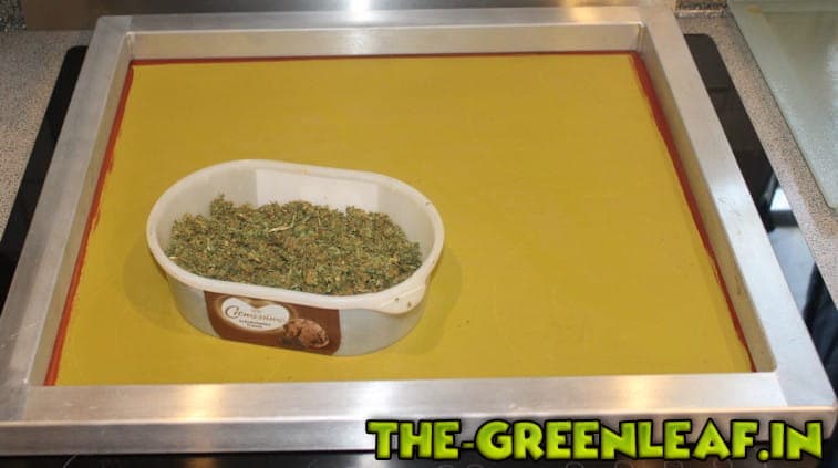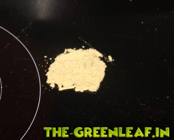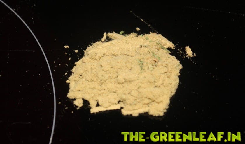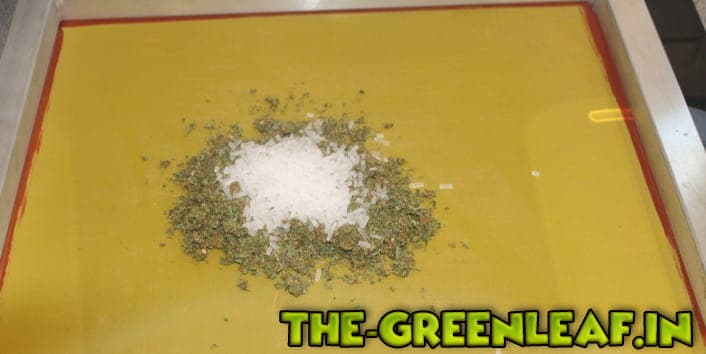 Bild 1 Zeigt das Sieb und darauf eine Schale mit ca.25g zerkleinerten Weedresten // Bild 2 = Mischung + ca. 30g Trockeneispellets (4-6mm)