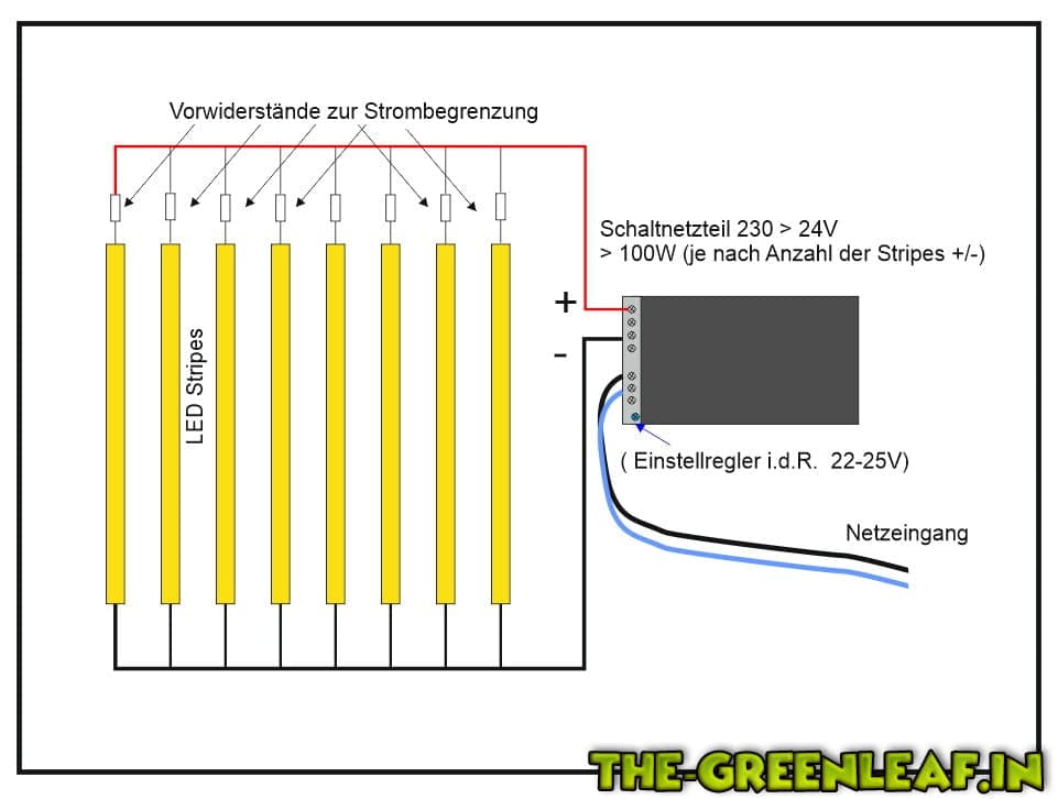 Dazu benötigst du lediglich ein 24V (>100W) Schatnetzteil und zu jedem Stripe einen Rv mit z.B. 3,3 Ohm (3-5W) -