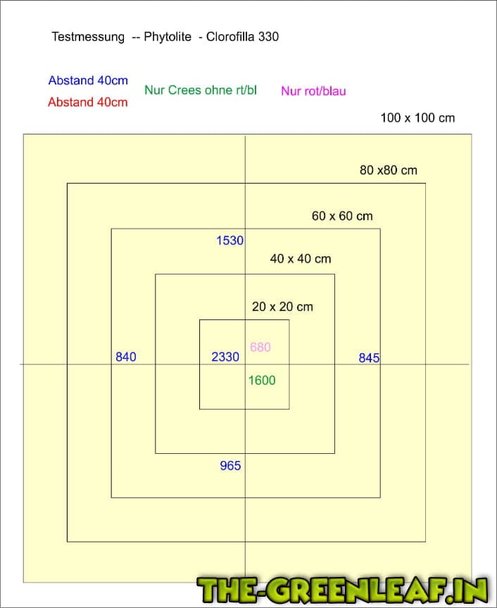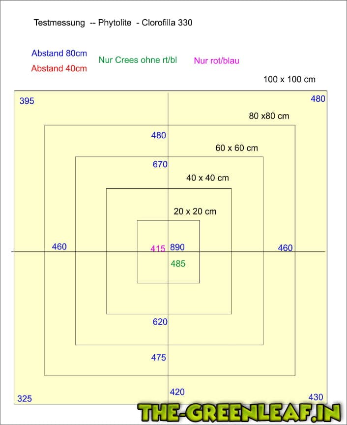 Die ersten groben Messungen bei ca. 40cm Abstand und ca. 60x60cm zeigten Werte zwischen 550 - 720 µmol
