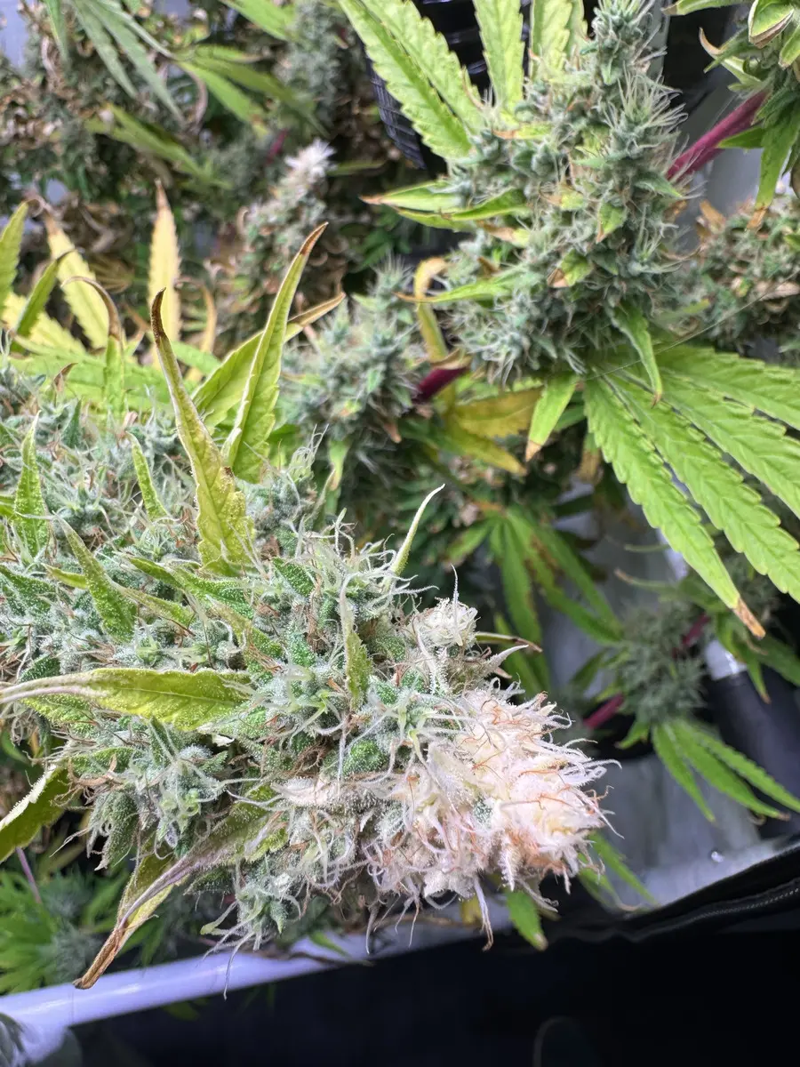 Vielen Dank für die vielen Antworten. Die haben mich schon mal beruhigt. Von selbst abfallen. Tut da nichts nach Schimmel riechen tut er auch nichts nach Schimmel aussehen eigentlich auch nicht. Ich vermute, es ist wirklich Lichtstress, weil ich zwei LEDs in meiner 1x1x2 Box habe und die Pflanzen schon sehr nah nach oben gewachsen sind. Ich hab zwar immer auf den Abstand geachtet, aber vermutlich war’s trotzdem zu viel Licht am Ende des Tages. Betroffen sind übrigens nur einzelne Buds.