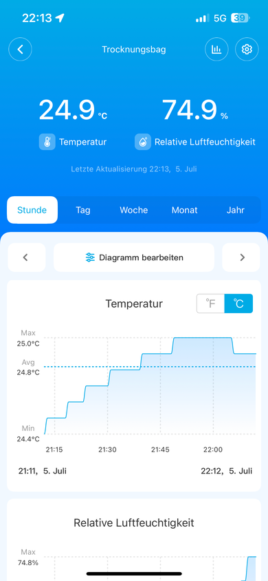 Hab leider kein kleines Glas wo mein Hygrometer reinpasst. Hab das jetzt so gemacht. Kann dann aber in der App den Verlauf sehen. Dauert beim großen Glas nur etwas länger oder?